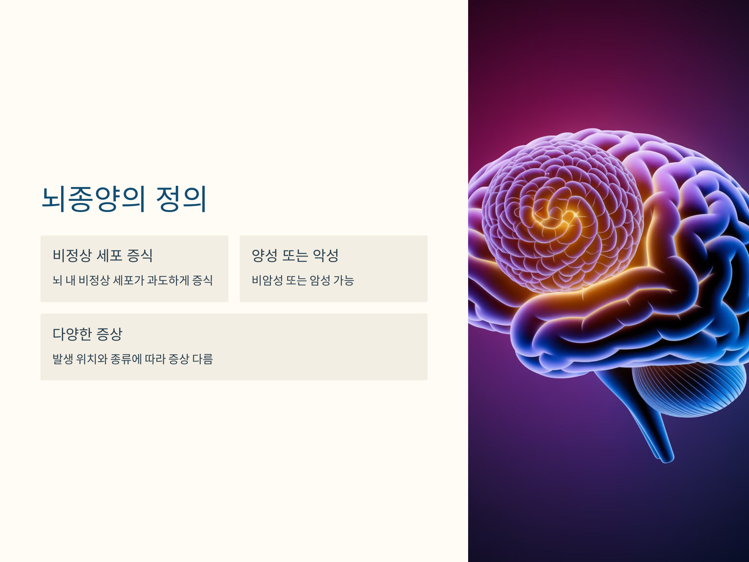 뇌종양은 뇌 내에서 비정상적인 세포가 과도하게 증식하여 형성되는 종양을 말합니다. 이러한 종양은 양성(비암성)일 수도 있고, 악성(암성)일 수도 있습니다. 뇌종양은 발생 위치와 종류에 따라 다양한 증상을 나타낼 수 있으며, 조기 발견과 치료가 중요합니다. citeturn0search8