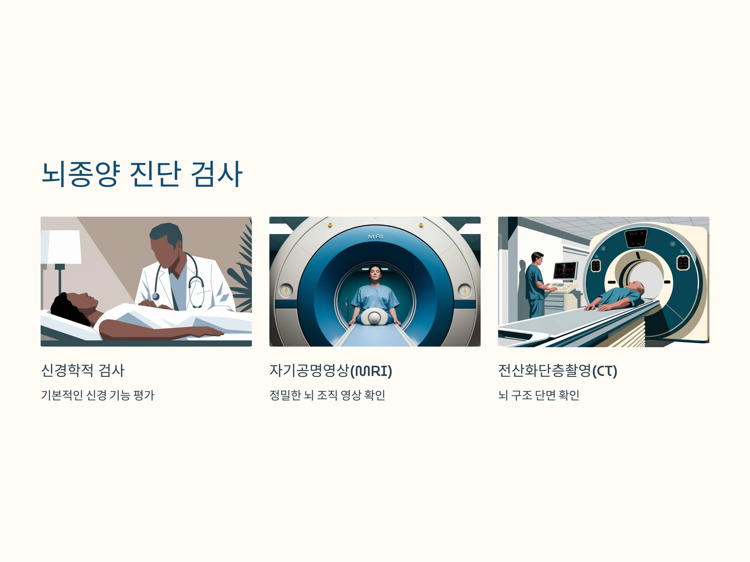 뇌종양이 의심되는 경우, 전문의와 상담하여 정확한 진단을 받는 것이 중요합니다. 일반적으로 시행되는 검사로는 신경학적 검사, 자기공명영상(MRI), 전산화 단층촬영(CT), 양전자 방출 단층촬영(PET) 등이 있습니다. 이러한 검사를 통해 종양의 위치, 크기, 종류 등을 파악할 수 있습니다. citeturn0search8