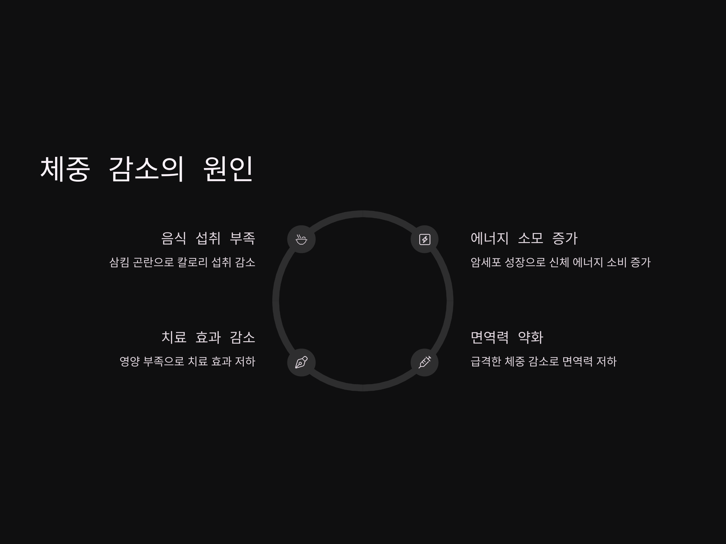 식도암으로 인한 체중 감소는 여러 가지 원인에 의해 발생할 수 있습니다. 첫 번째 원인은 삼킴 곤란으로 인한 음식 섭취 부족입니다. 환자는 음식을 먹는 데 어려움을 겪고, 이에 따라 하루에 섭취하는 칼로리와 영양소가 급격히 줄어들게 됩니다. 두 번째 원인은 식도암이 진행되면서 신체가 더 많은 에너지를 소모하게 되는 것입니다. 암세포가 빠르게 성장하면서 신체는 이를 공격하기 위해 많은 에너지를 소비하고, 이로 인해 체중이 빠르게 감소할 수 있습니다.