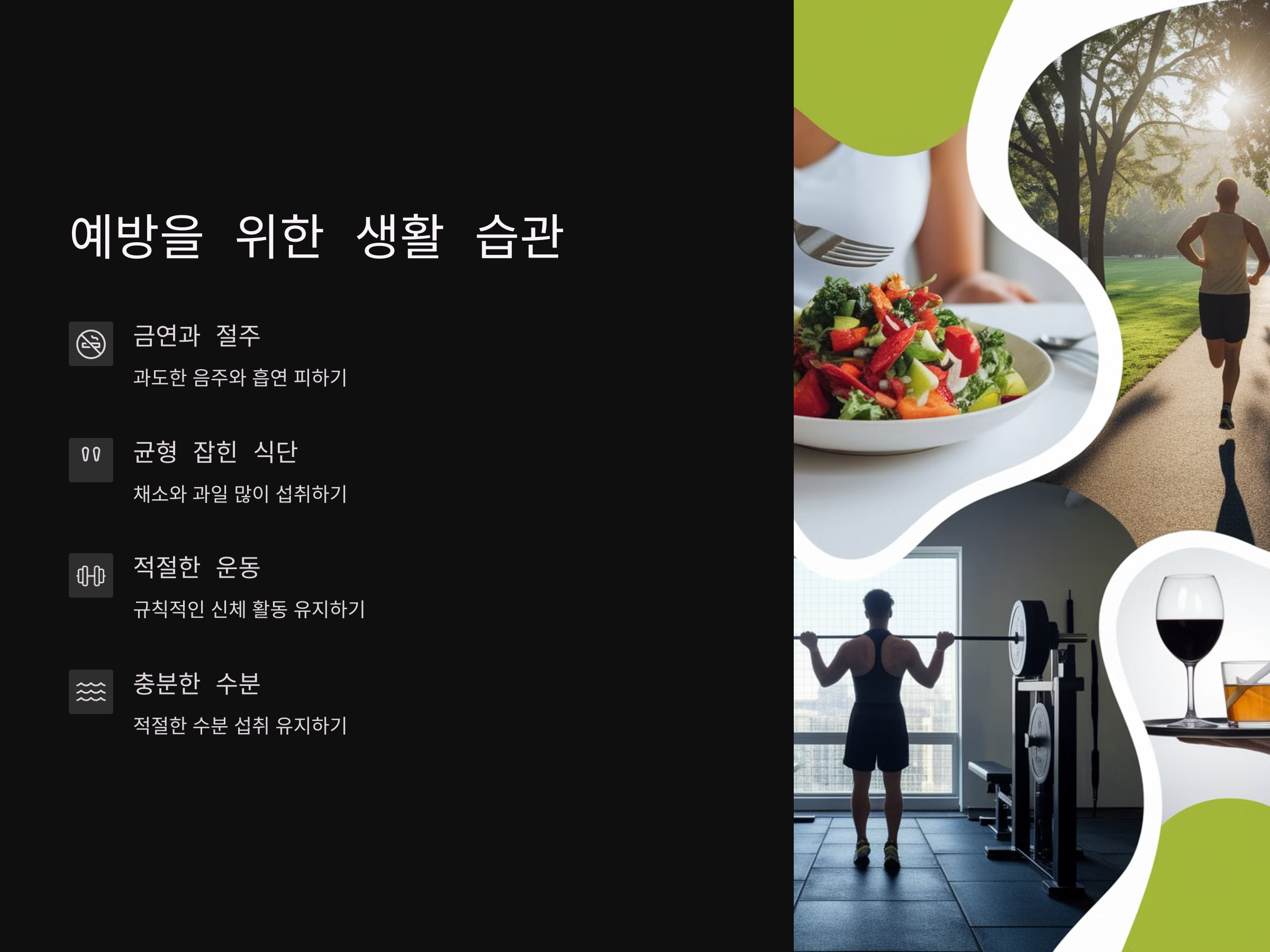 식도암을 예방하는 가장 좋은 방법은 건강한 생활 습관을 유지하는 것입니다. 과도한 음주와 흡연은 식도암의 주요 원인으로 알려져 있습니다. 이러한 습관을 피하고, 균형 잡힌 식단과 적절한 운동을 통해 건강을 유지하는 것이 중요합니다. 특히, 식사 시 과식이나 급하게 음식을 삼키지 않도록 주의하고, 식사 후에는 규칙적인 소화를 도울 수 있는 활동을 하는 것이 좋습니다.