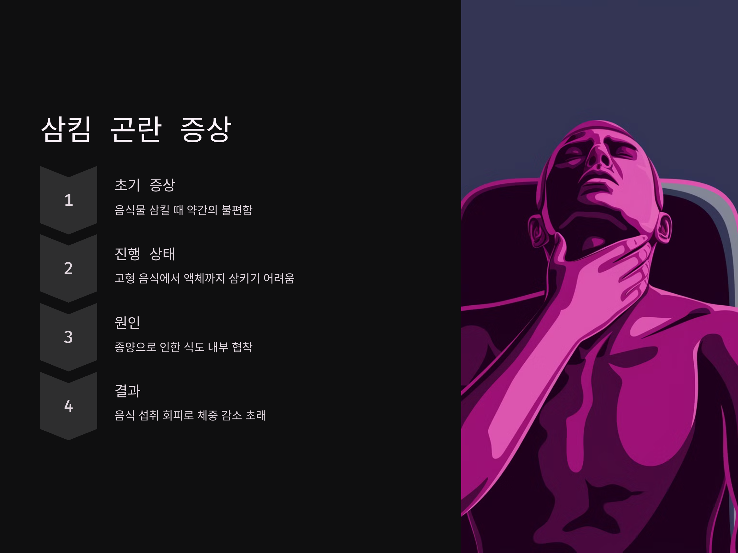 삼킴 곤란은 환자가 음식 섭취를 피하게 만들고, 이는 체중 감소를 초래하는 주요 원인 중 하나입니다. 특히 체중이 급격하게 감소하면 면역력이 약해지고, 치료 효과가 떨어질 수 있습니다. 이 경우, 영양 공급을 위한 보충제나 특수한 식이 요법이 필요할 수 있습니다. 또한, 삼킴 곤란을 개선하기 위한 다양한 치료법이 있지만, 이러한 치료 방법들은 모두 식도암의 진행 상태와 환자의 건강 상태에 따라 달라지기 때문에 전문가의 상담이 필수적입니다.
