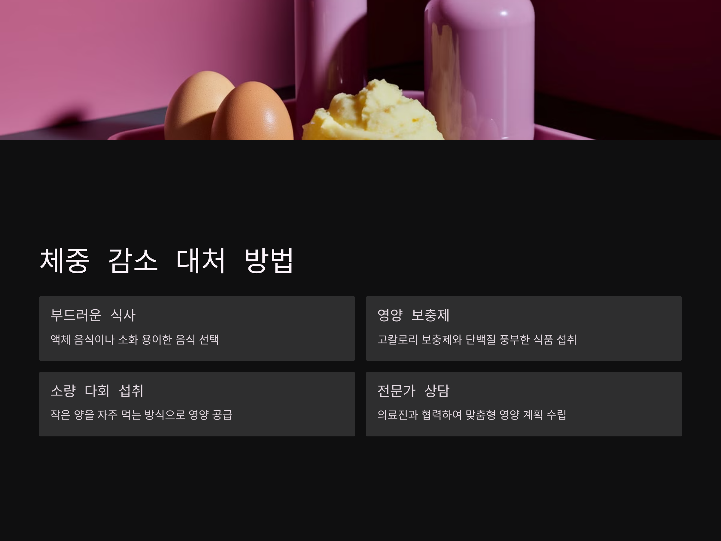 체중 감소를 막기 위해서는 환자에게 적합한 영양 섭취 방법을 찾는 것이 중요합니다. 고형식보다는 부드러운 액체 음식이나 소화가 용이한 음식을 선택하는 것이 좋습니다. 또한, 전문가의 도움을 받아 고칼로리 보충제나 단백질이 풍부한 음식을 포함한 식이 요법을 시행하는 것이 효과적입니다. 의료진과의 협력을 통해 체중을 유지하거나 증가시킬 수 있는 방법을 모색하는 것이 중요합니다.