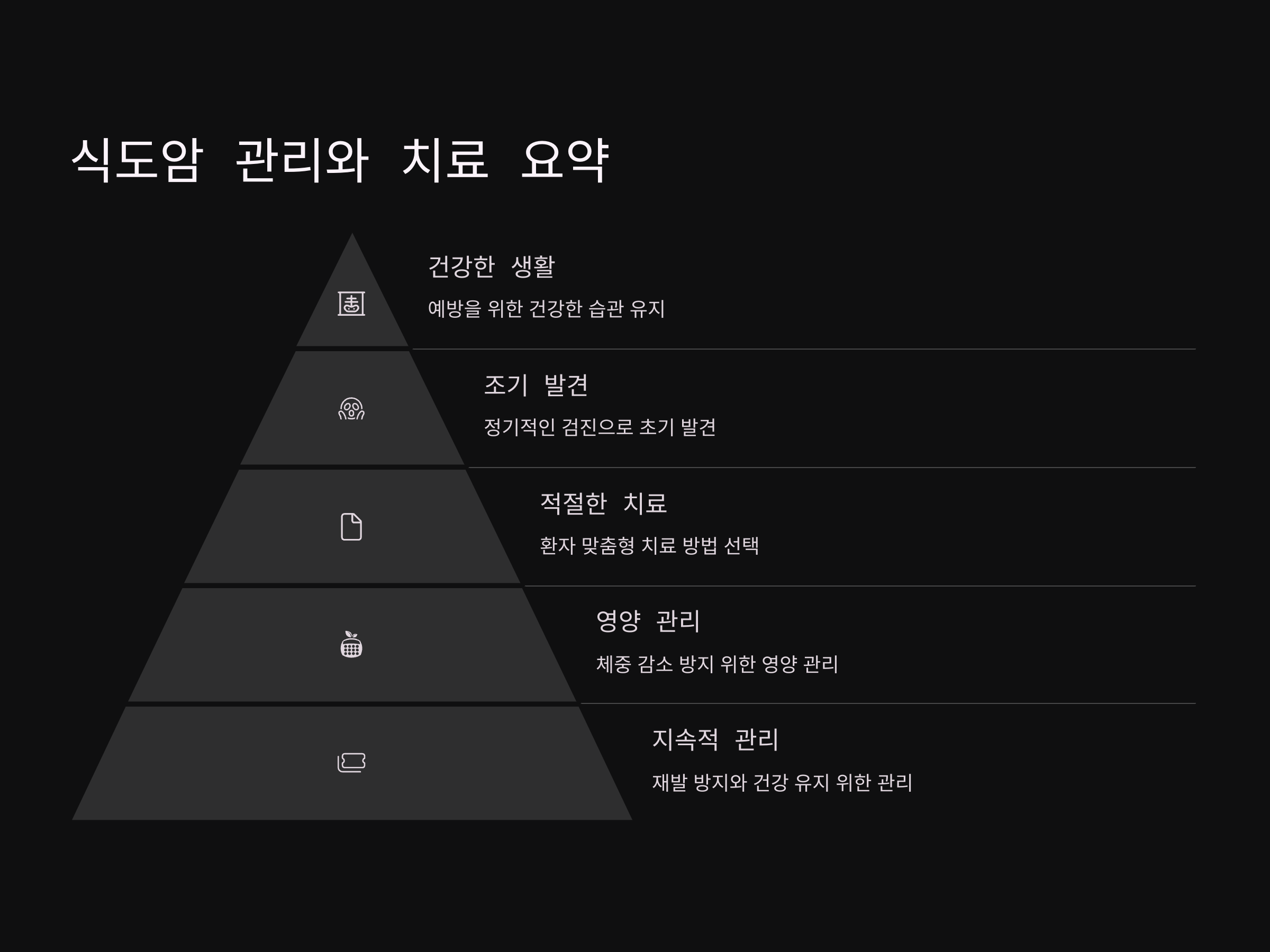 식도암 치료에는 수술, 방사선 치료, 화학요법 등이 포함되며, 각 환자에게 맞는 치료 방법을 선택해야 합니다. 식도암 예방을 위해서는 건강한 생활 습관을 유지하고, 정기적인 검진을 통해 질병을 조기에 발견하는 것이 중요합니다.