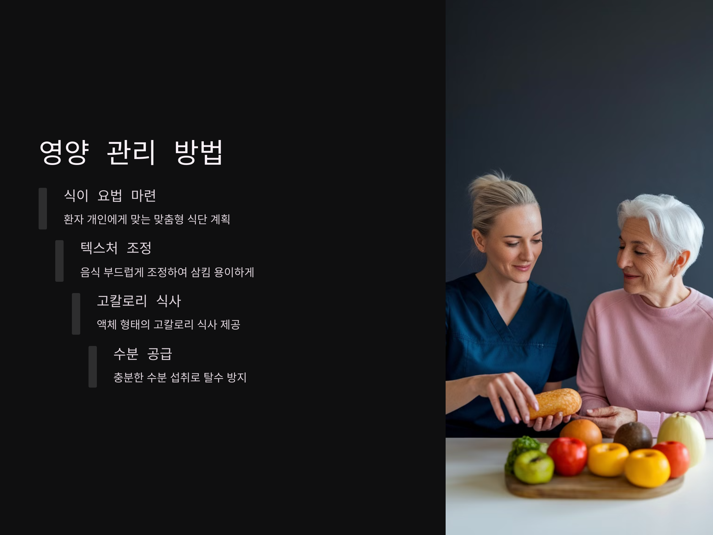 영양 관리 방법에는 음식의 텍스처를 부드럽게 조정하거나, 액체 형태로 섭취할 수 있는 고칼로리 식사를 제공하는 방법이 포함됩니다. 또한, 환자에게 충분한 수분을 공급하고, 작은 양을 자주 섭취하는 방식으로 체중 감소를 방지할 수 있습니다. 이를 위해 의료 전문가와 협력하여 적절한 영양 계획을 세우는 것이 중요합니다.