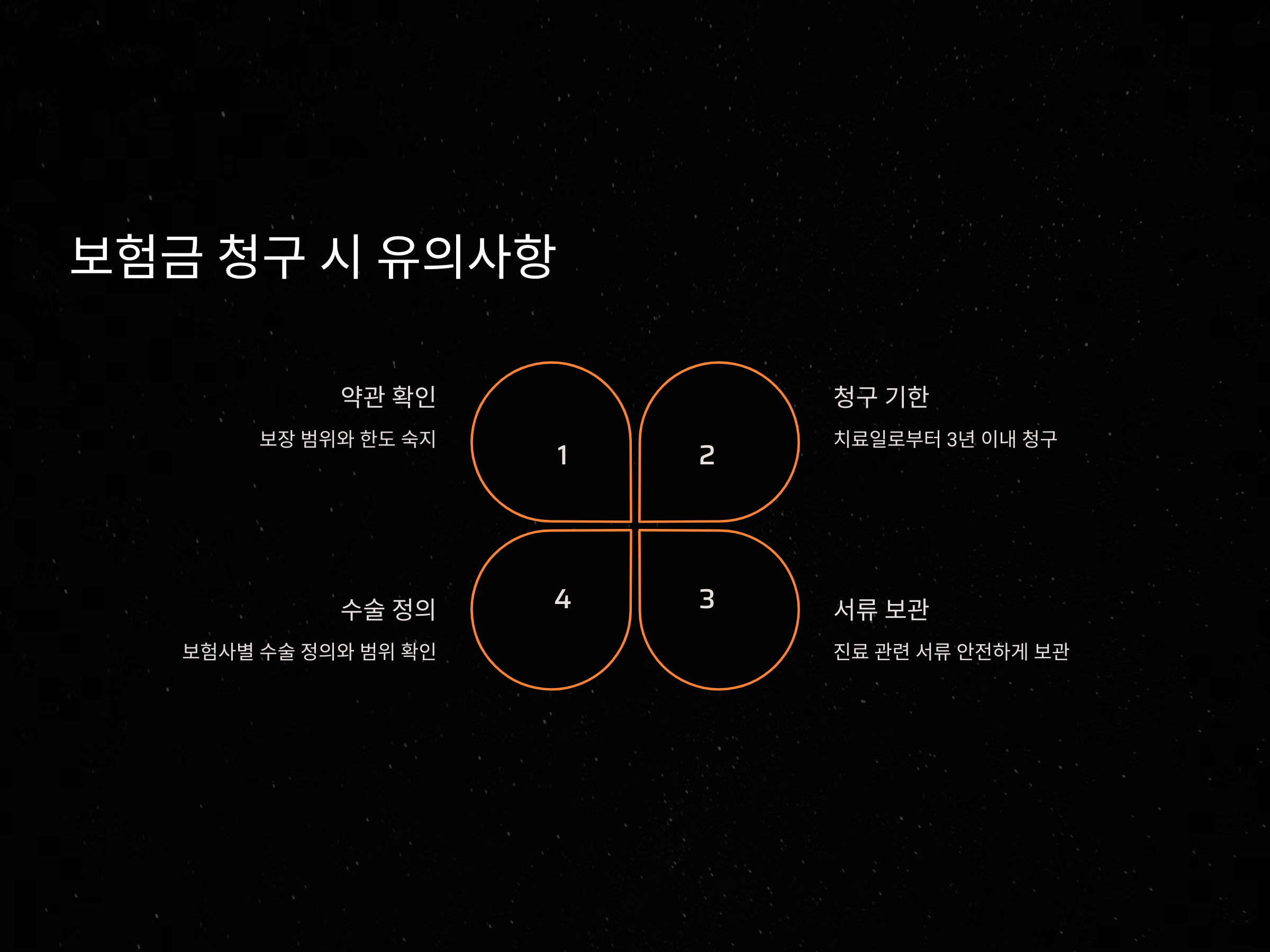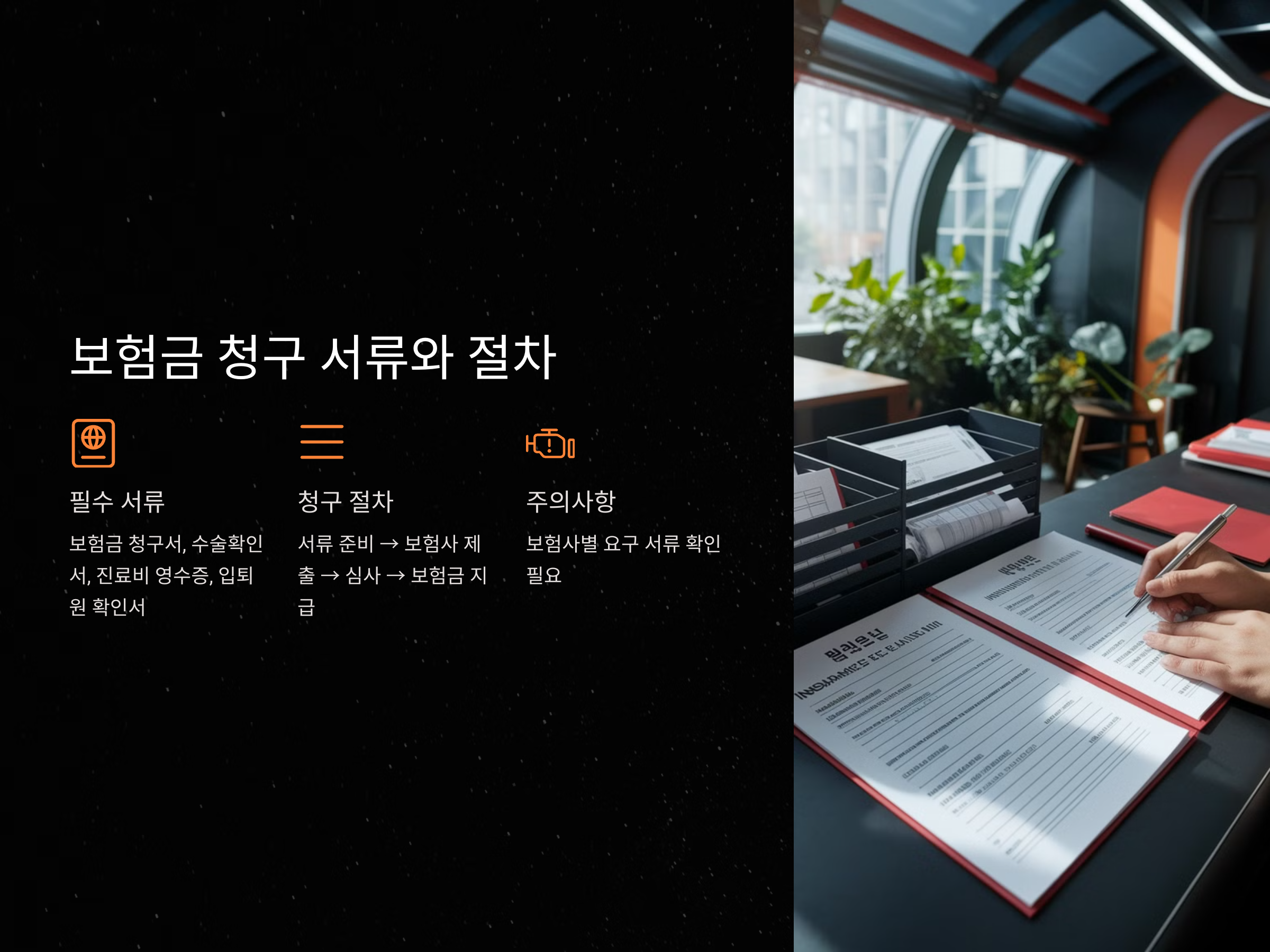- 청구 기한 준수: 일반적으로 보험금 청구는 치료일로부터 3년 이내에 해야 합니다.