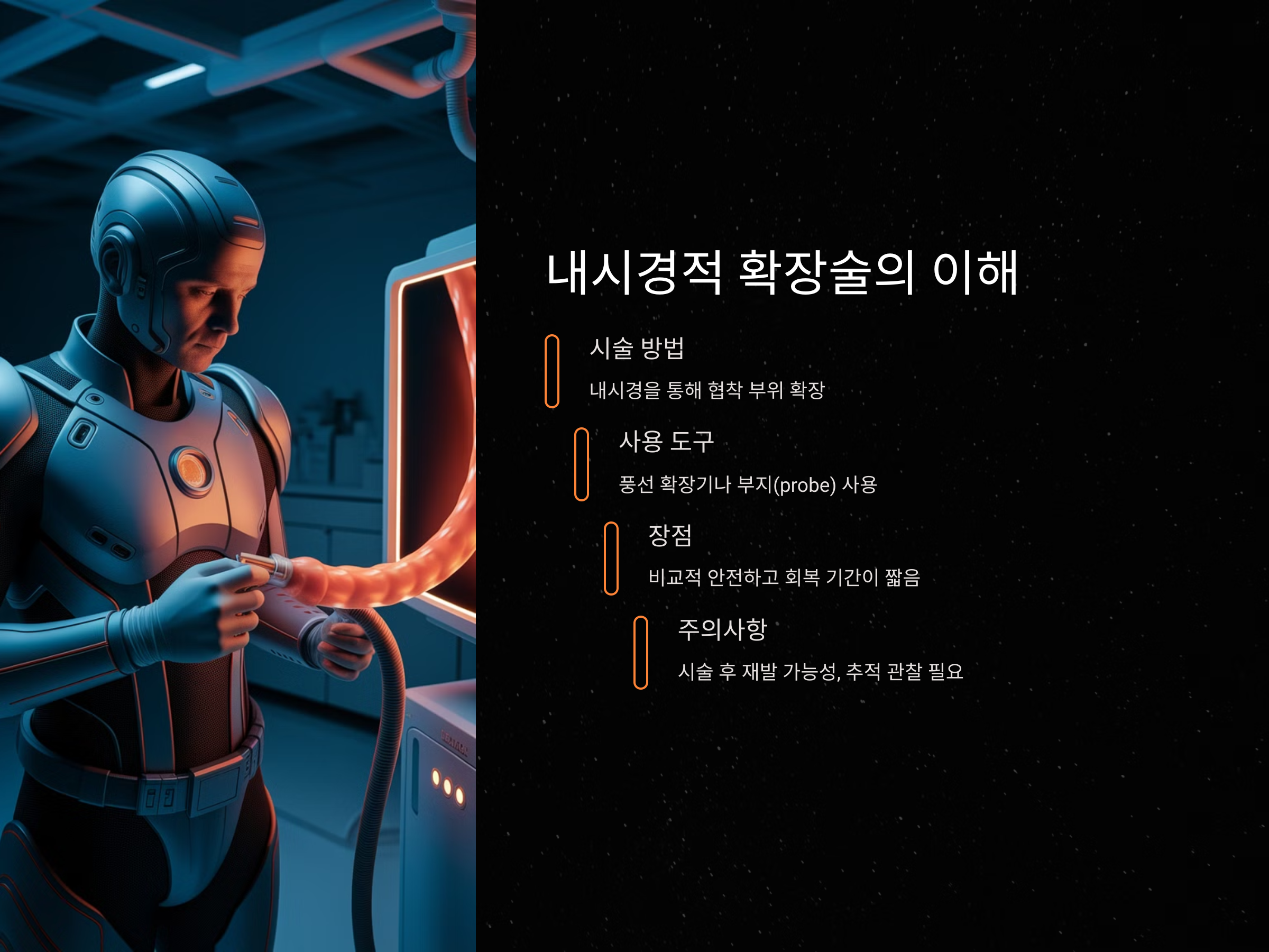 내시경적 확장술은 이러한 협착 부위를 내시경을 통해 확장시키는 시술입니다. 풍선 확장기나 부지(probe)를 사용하여 협착된 부위를 넓히며, 비교적 안전하고 회복 기간이 짧은 것이 특징입니다. 그러나 시술 후 재발 가능성이 있으므로 주의 깊은 추적 관찰이 필요합니다.