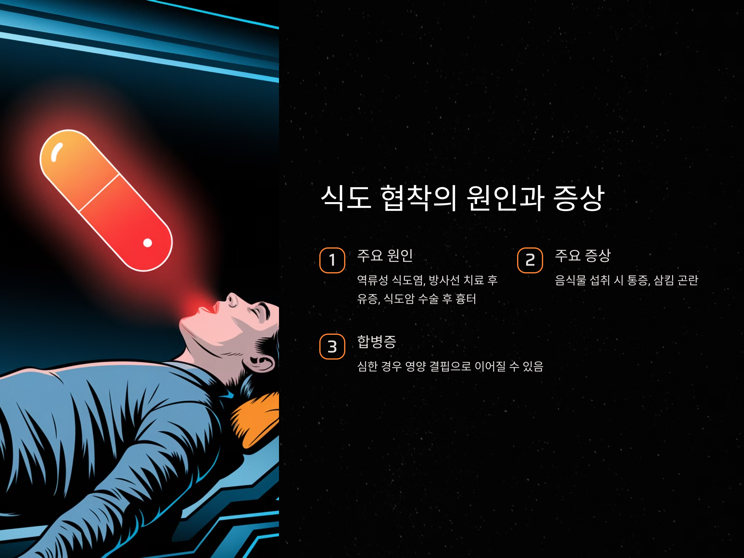 식도 협착은 여러 원인에 의해 발생할 수 있습니다. 대표적으로는 만성적인 역류성 식도염, 방사선 치료 후유증, 식도암 수술 후 흉터 등이 있습니다. 이러한 협착은 음식물 섭취 시 통증이나 삼킴 곤란을 유발하며, 심한 경우 영양 결핍으로 이어질 수 있습니다.