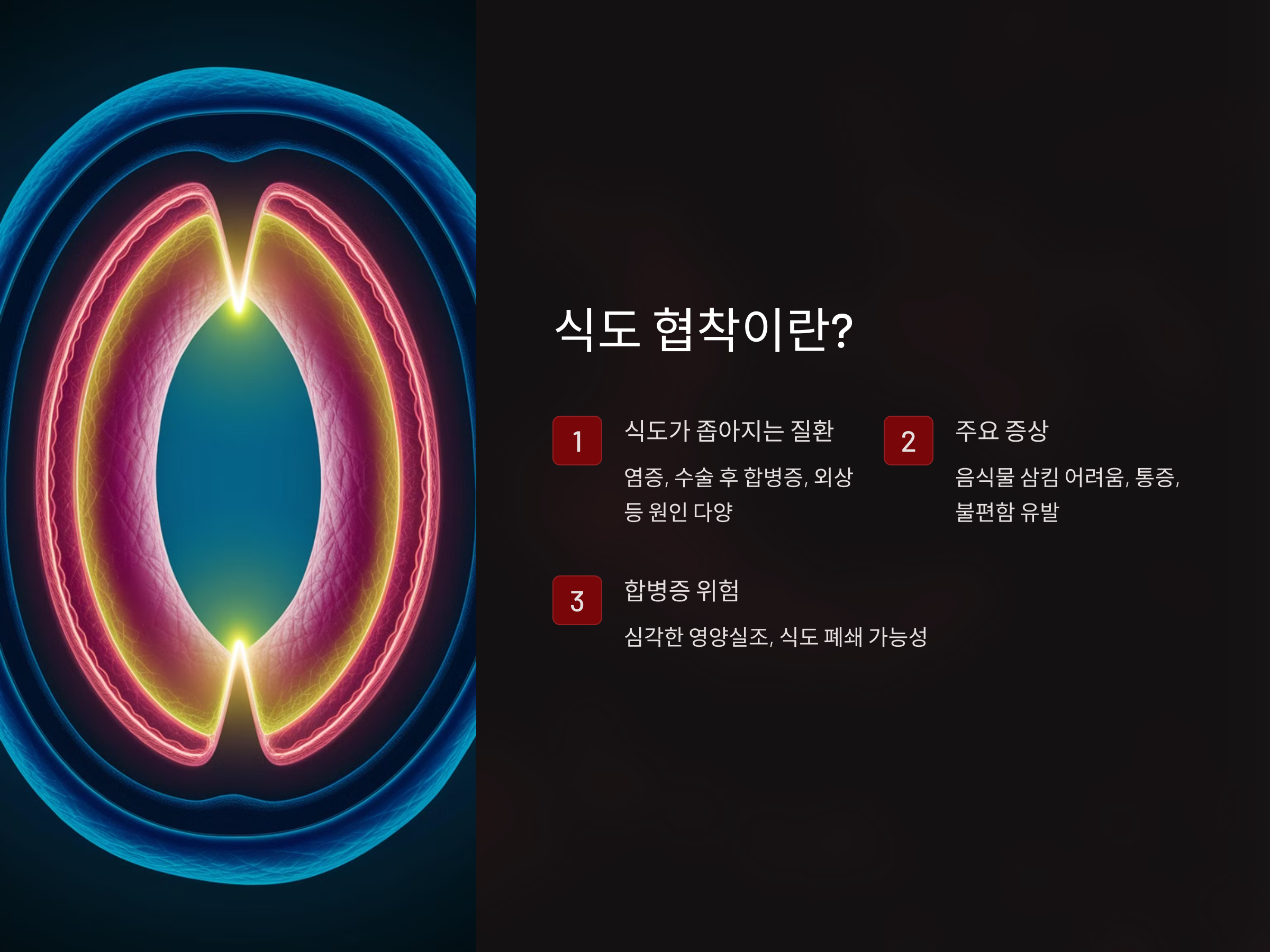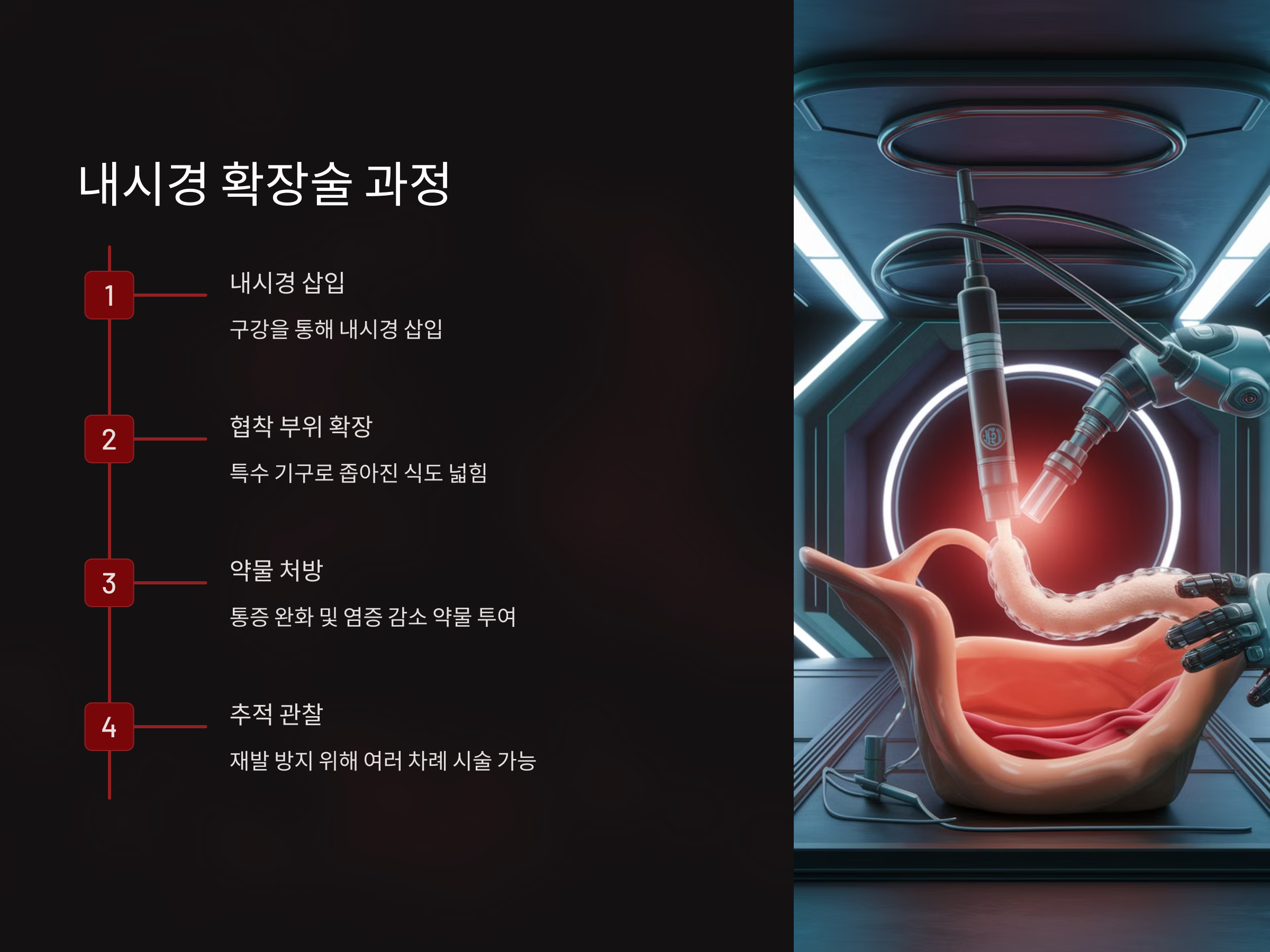 내시경 확장술은 시술 시간이 짧고, 입원 없이 외래에서 진행할 수 있다는 장점이 있습니다. 일반적으로 내시경을 삽입한 후, 협착된 부위를 확장하는 기구를 사용하여 식도 내벽을 넓혀주며, 그 후에는 통증이나 불편함을 줄여주는 약물을 처방합니다. 이 치료는 재발 방지를 위해 여러 차례 진행될 수 있습니다.