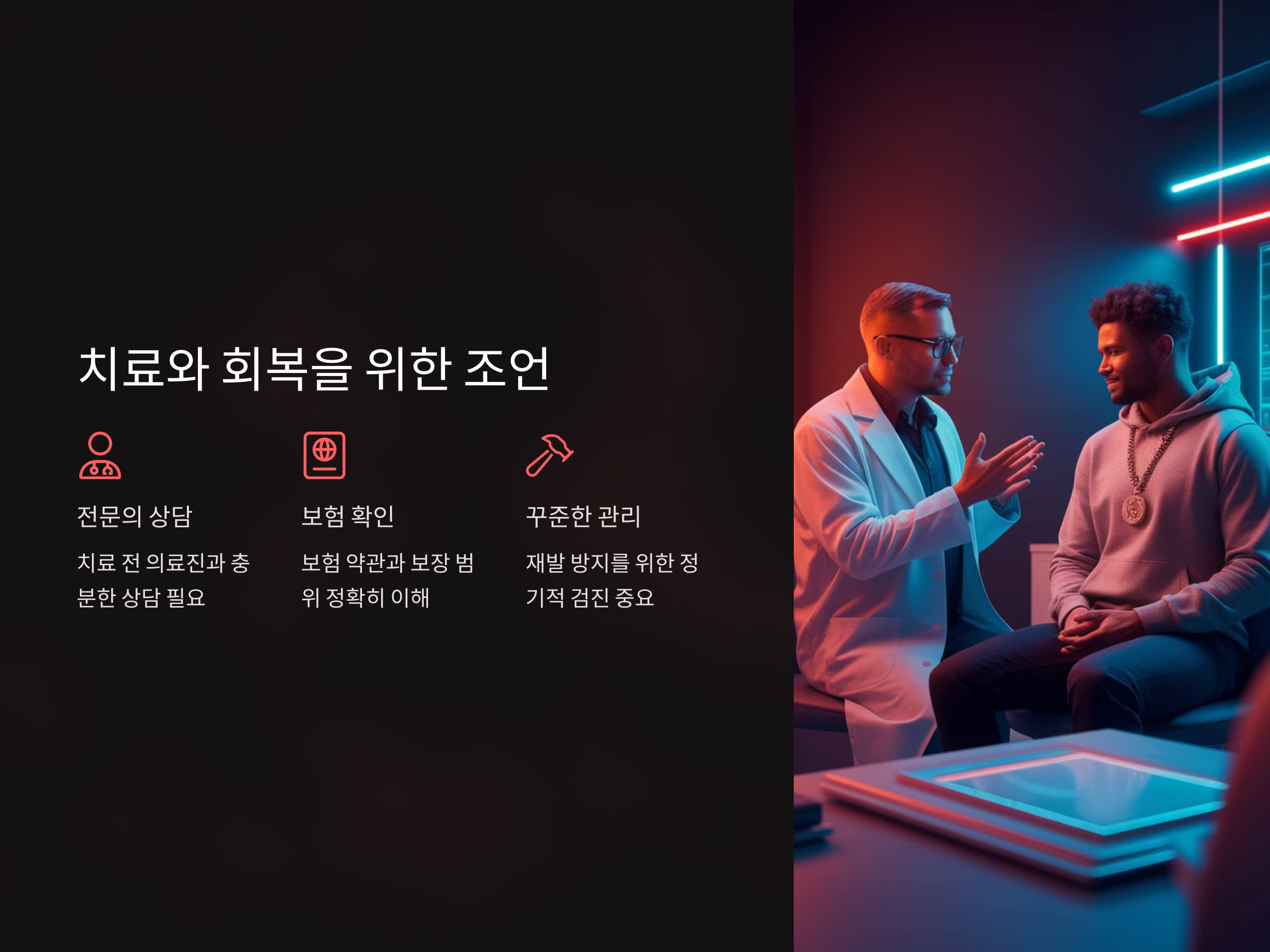 또한 실손보험의 경우, 보험 약관에 따라 보장 범위가 달라지므로 가입한 보험사의 정책을 정확히 이해하고, 추가 비용 부담을 줄일 수 있는 방법을 모색하는 것이 좋습니다. 치료 전 충분한 정보 수집과 상담을 통해 비용 부담을 최소화하고, 빠른 회복을 위한 최선의 방법을 선택하세요.