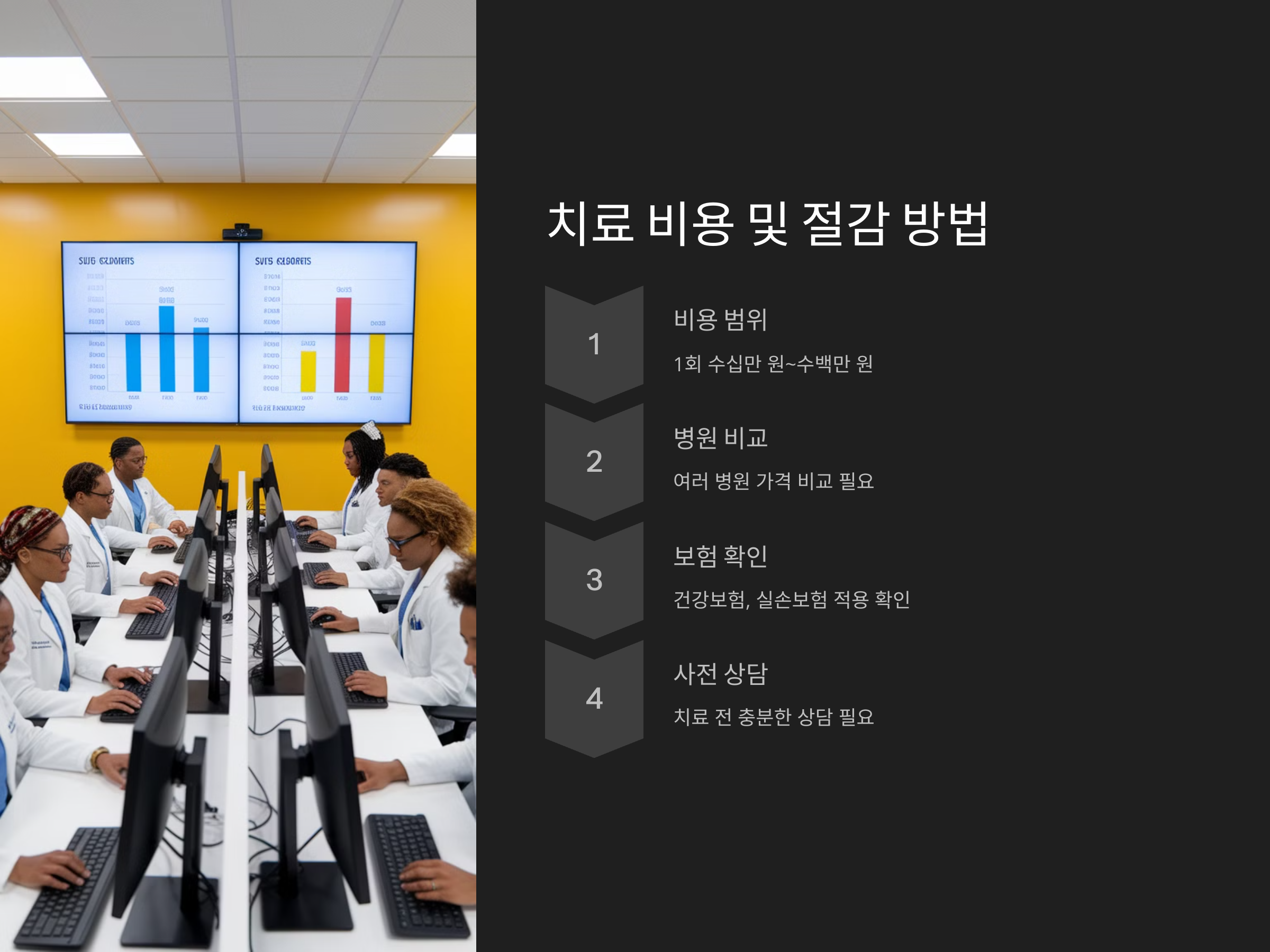 비용을 절감하기 위해서는 먼저 건강보험 적용 범위와 실손보험 보장 범위를 잘 이해하고, 치료를 받기 전에 병원과 충분한 상담을 하는 것이 좋습니다. 또한, 여러 병원의 가격을 비교하고, 실손보험의 보장 범위에 맞는 상품을 선택하는 것도 도움이 될 수 있습니다.
