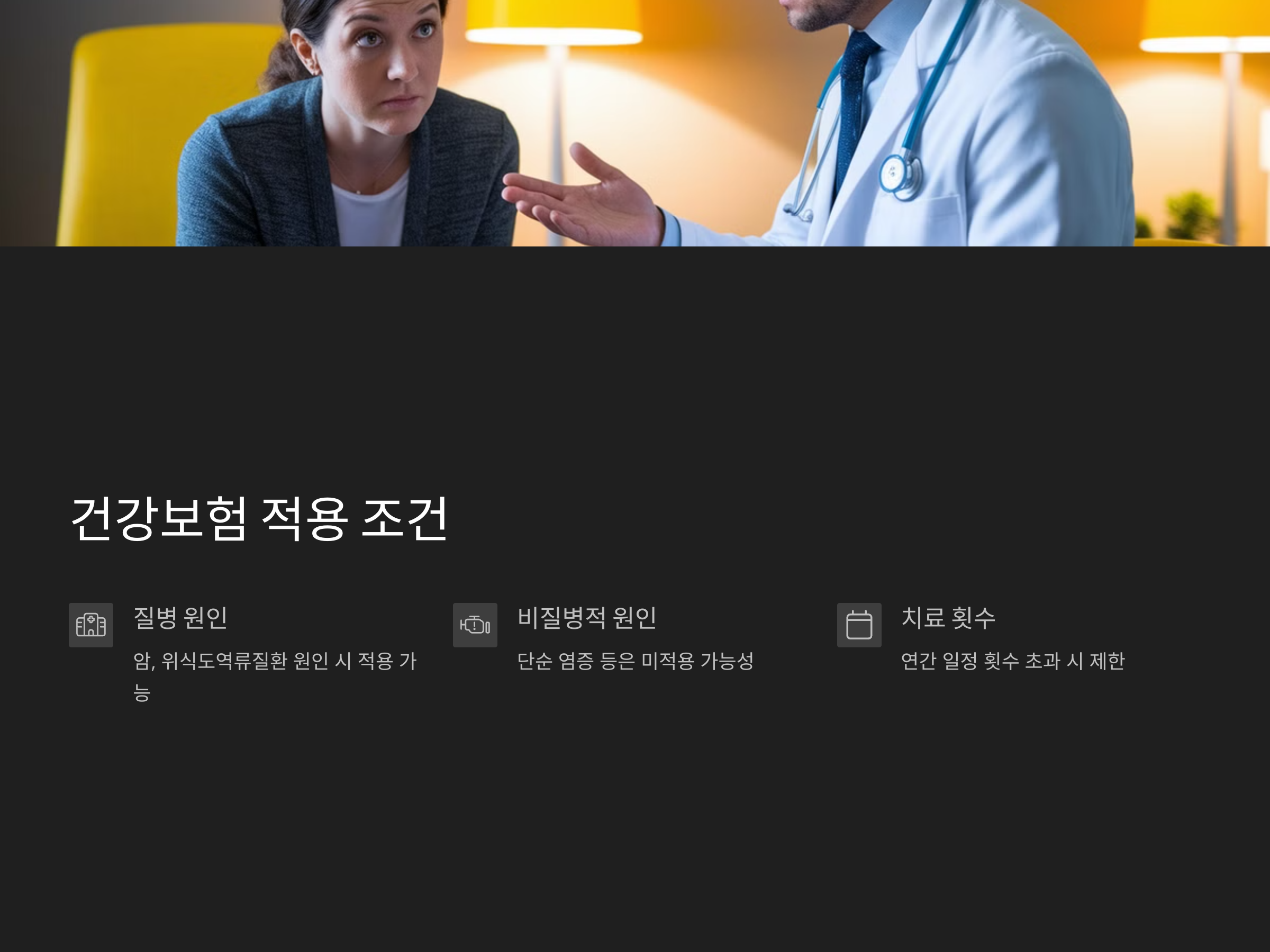 식도 협착이 암이나 기타 중대한 질병으로 인한 경우에는 건강보험 적용이 될 확률이 높습니다. 예를 들어, 식도암이나 위식도역류질환 등으로 인해 발생한 식도 협착의 경우, 내시경 확장술이 치료의 일환으로 진행되면 보험 혜택을 받을 수 있습니다. 그러나, 단순한 염증이나 다른 비질병적 원인에 의한 협착의 경우에는 건강보험 적용이 되지 않을 수 있습니다.