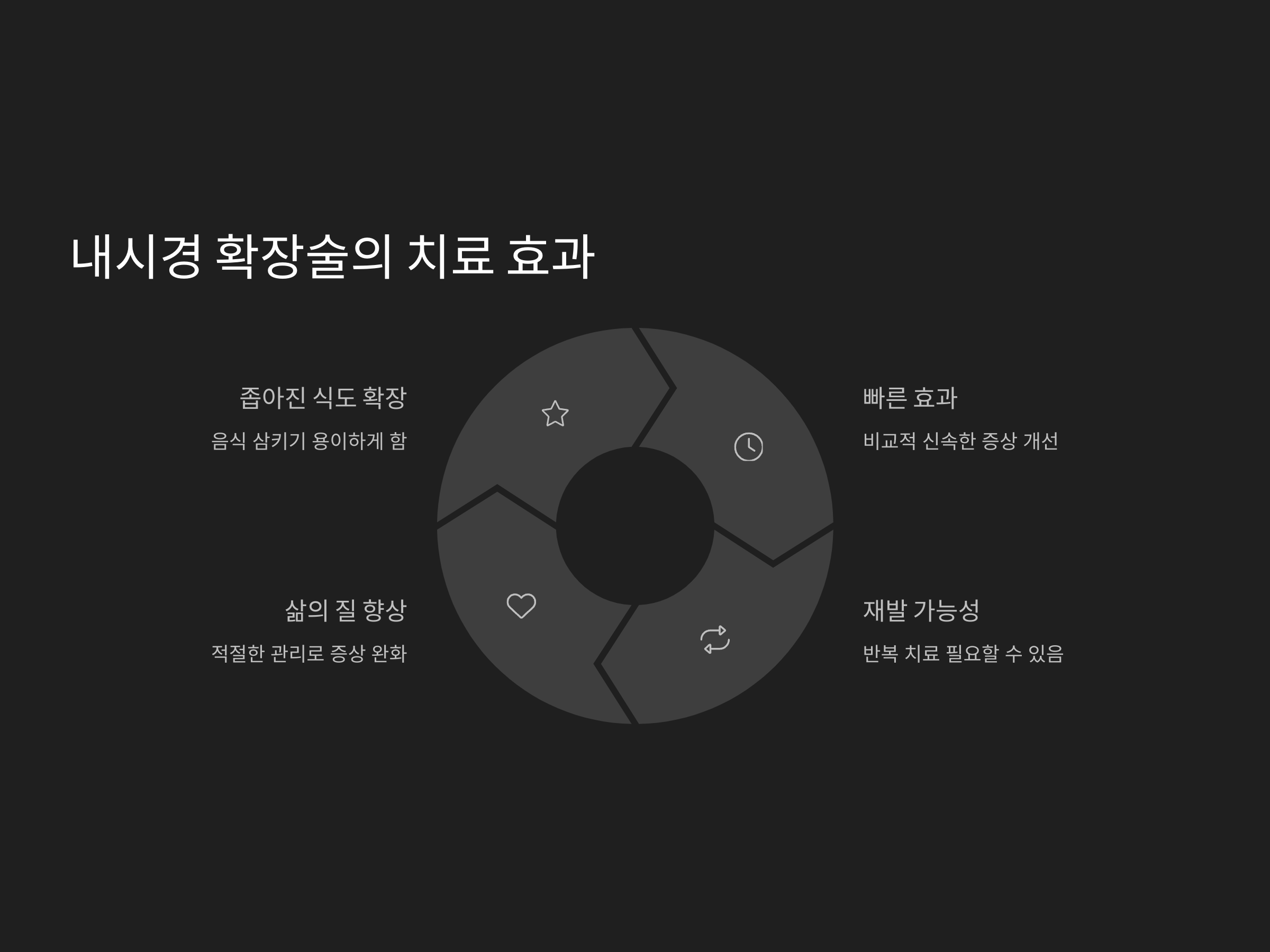 내시경 확장술 후 환자는 일부 불편함을 느낄 수 있으며, 치료 후 약간의 통증이나 불편감을 경험할 수 있습니다. 대부분의 경우 이 증상은 일시적이며, 치료가 잘 이루어졌다면 빠르게 회복됩니다. 또한, 내시경 치료 후에는 식사를 천천히 시작하고, 차가운 음식이나 딱딱한 음식은 피하는 것이 좋습니다.