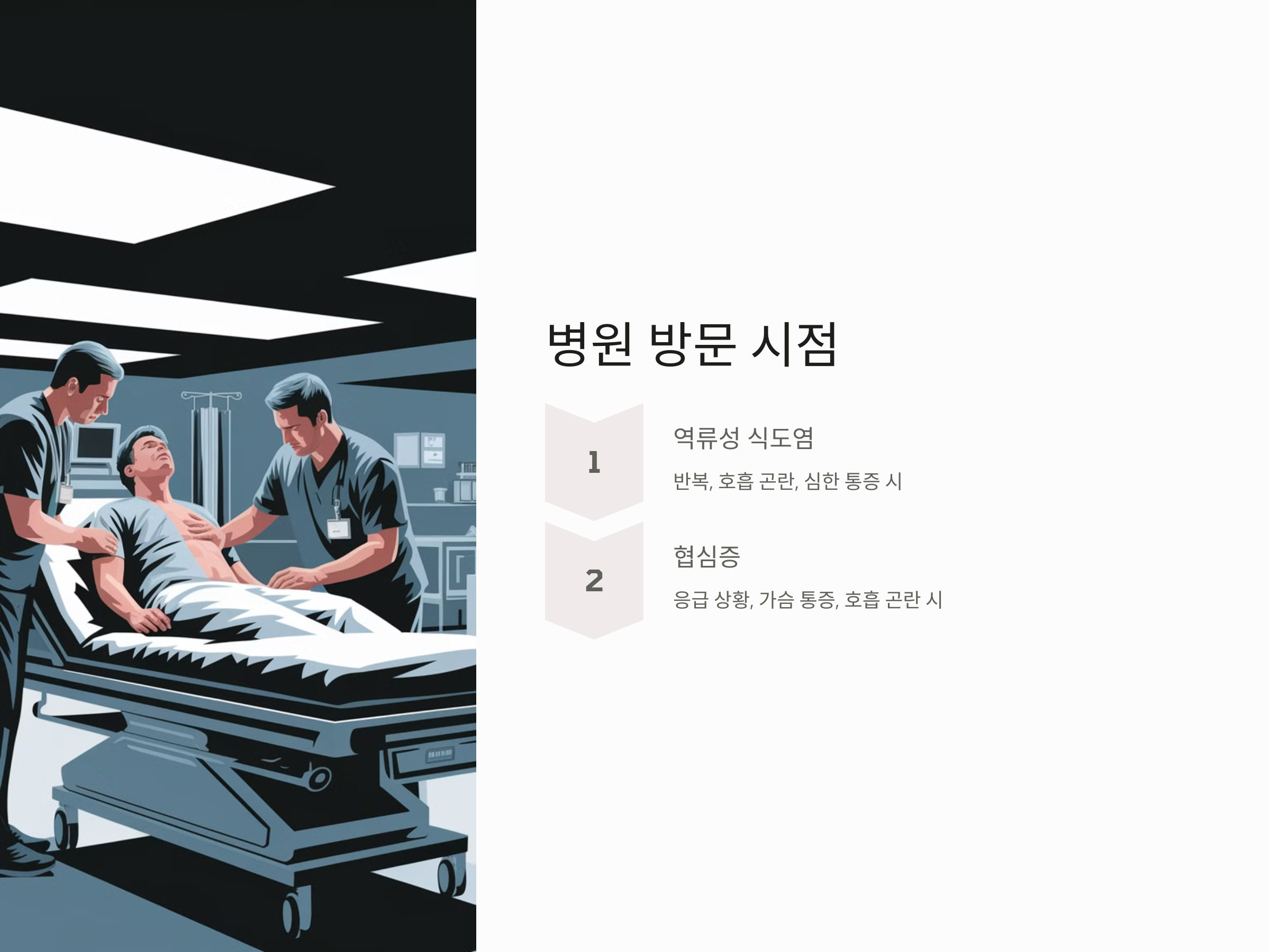 - 역류성 식도염은 주로 식사 후, 특히 기름진 음식이나 술 후에 증상이 악화됩니다. 증상은 일반적으로 식사 후 30분에서 1시간 이내에 발생하며, 누운 자세에서 증상이 심해질 수 있습니다.
