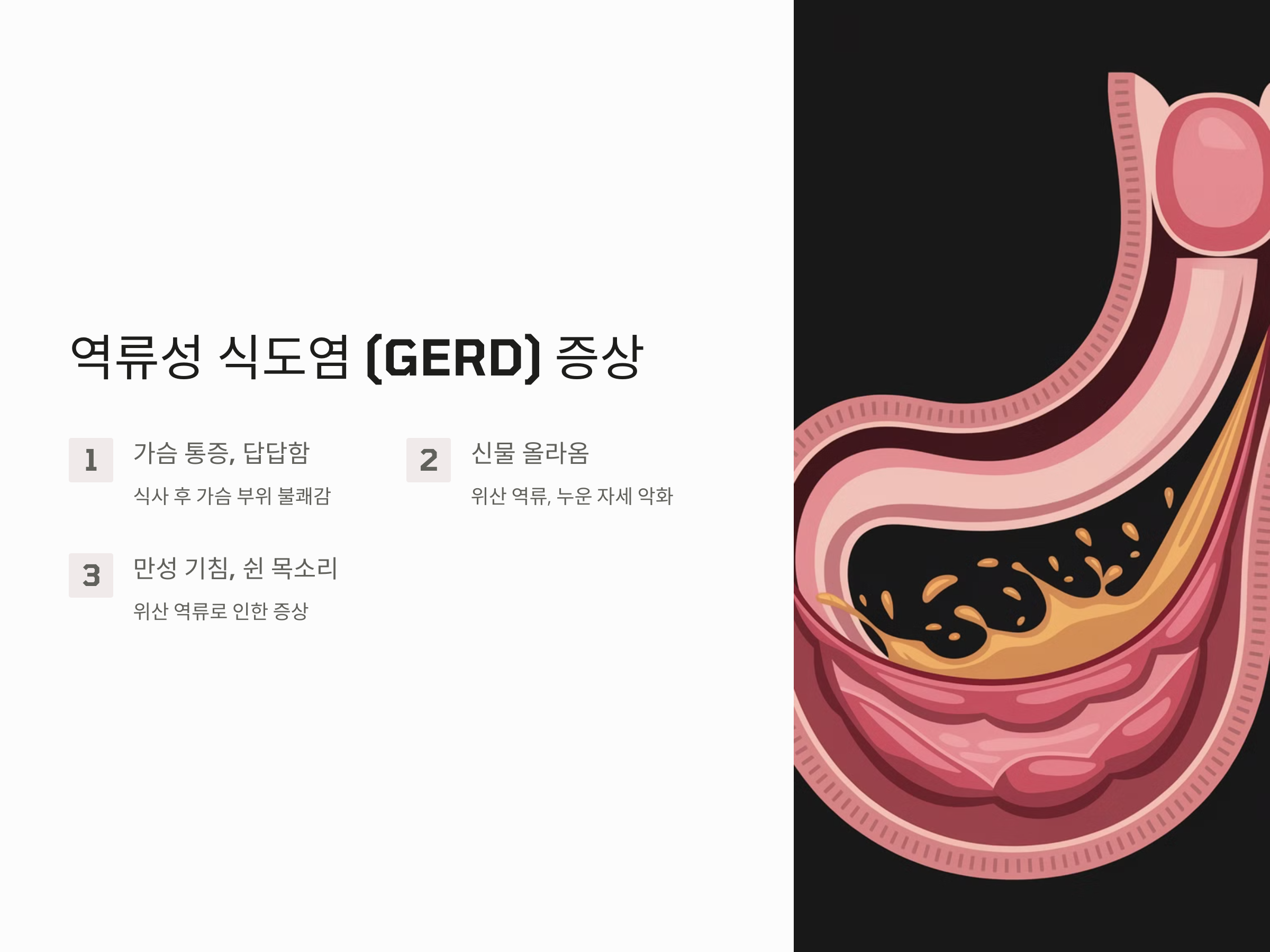 위산이 식도로 역류하면서 기침을 유발하거나, 목이 쉰 느낌, 이물감 등을 동반할 수 있습니다.