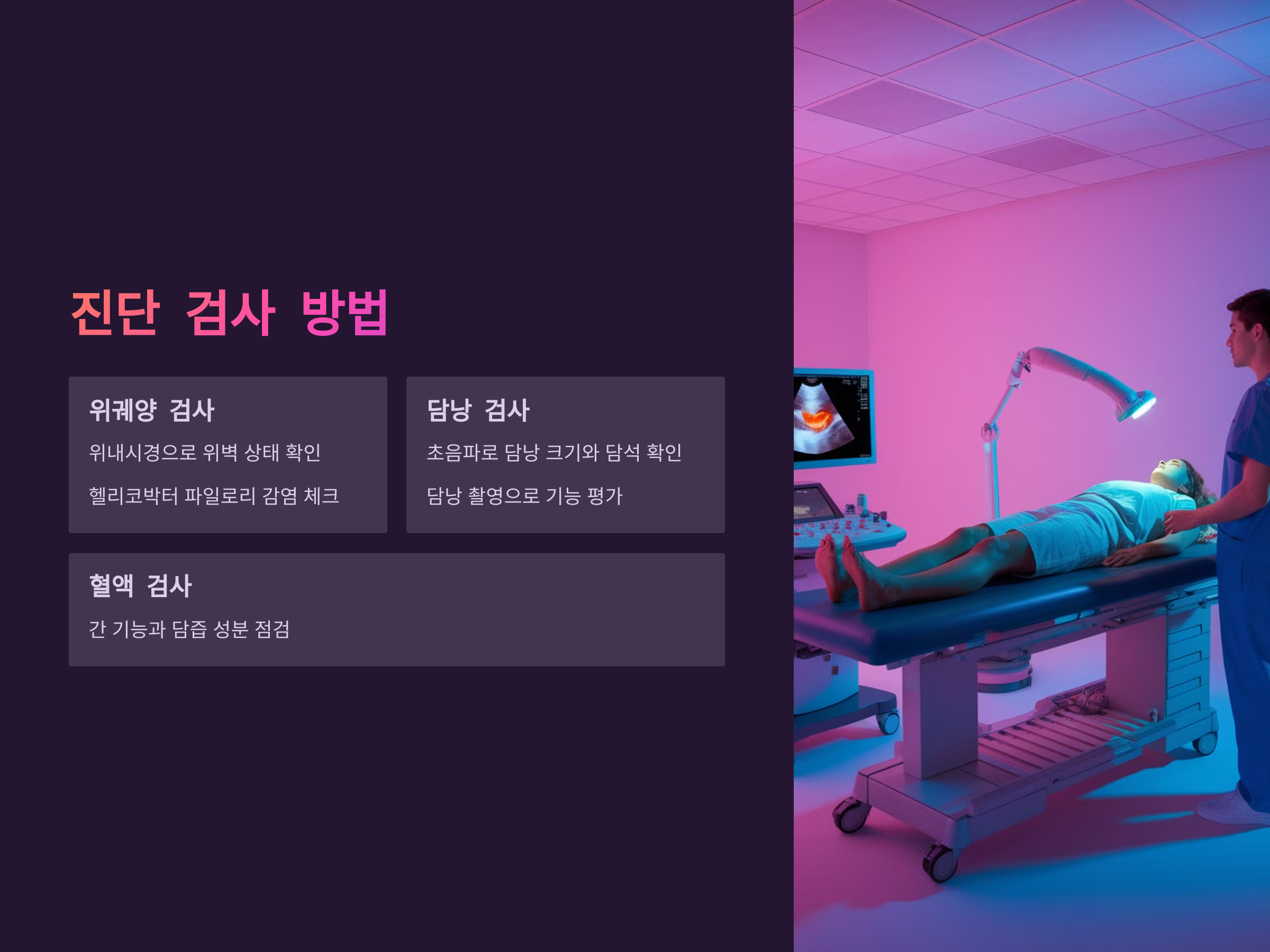 - 치료 방법: 위궤양은 위산 억제제와 항생제를 사용하며, 담낭 기능 저하는 담즙 분비를 촉진하는 약물이나 식이요법으로 관리됩니다.