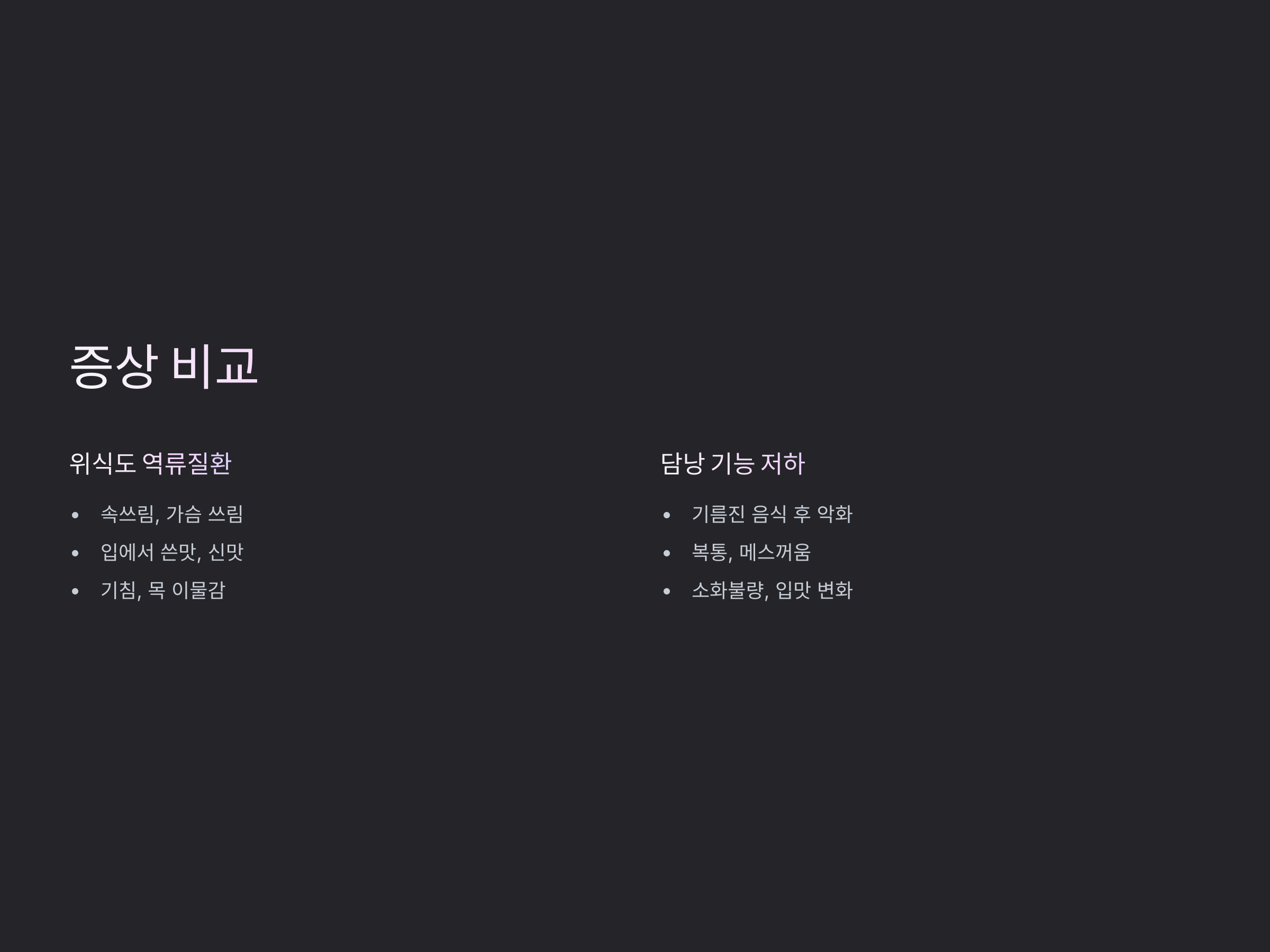 두 질환 모두 소화기 계통의 문제로 발생하지만, 각각 다른 원인으로 발생합니다. 위식도 역류질환은 위산 역류로 발생하고, 담낭 기능 저하는 담즙 분비 문제로 발생합니다. 이로 인해 배가 빵빵해지고 트림이 자주 나오는 증상이 나타날 수 있습니다.