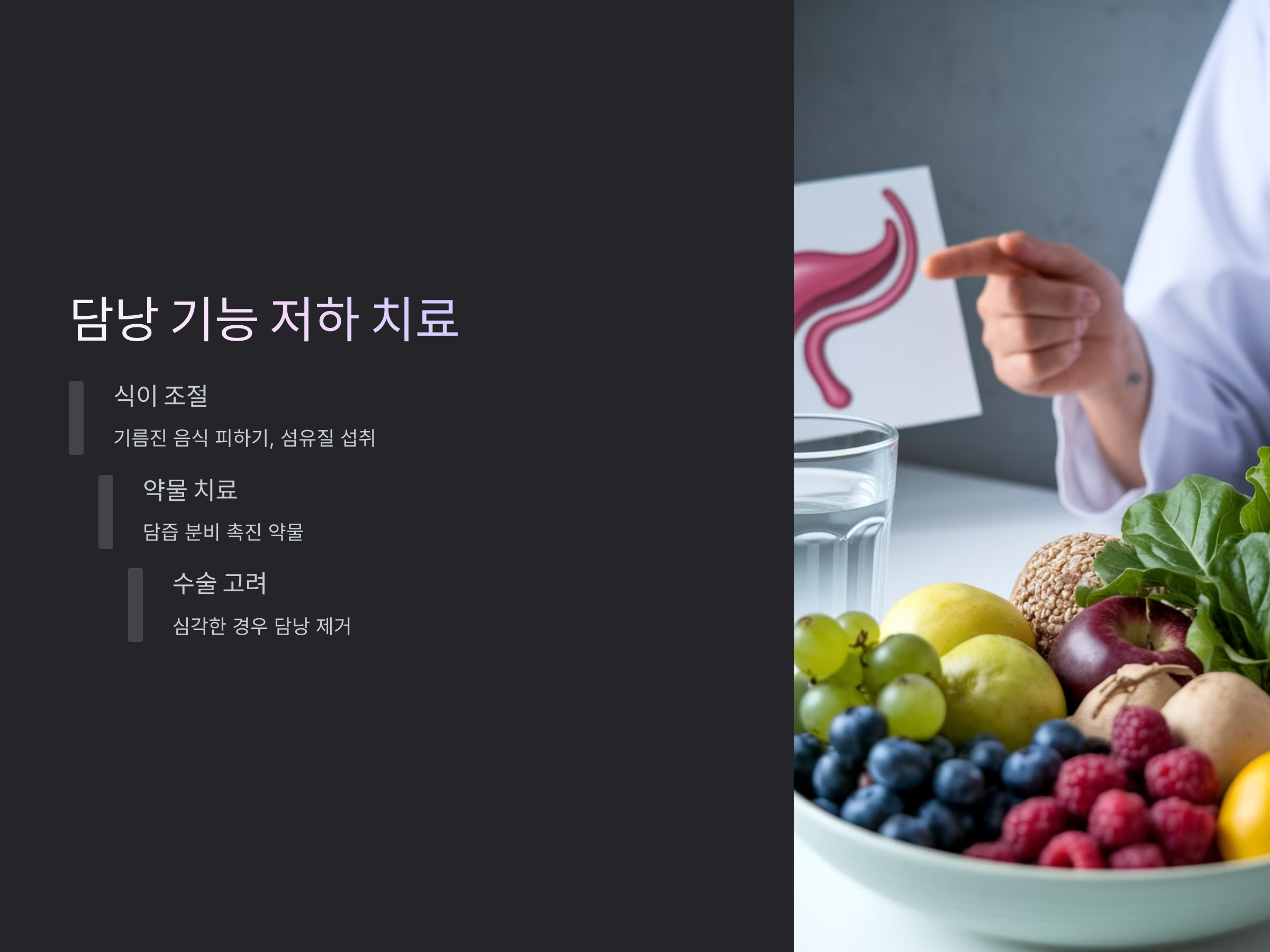 담낭 기능 저하의 경우, 기름진 음식을 피하고, 담즙 분비를 촉진하는 음식(예: 섬유질이 많은 음식)을 섭취하는 것이 좋습니다. 또한, 약물 치료가 필요할 수 있으며, 담낭에 심각한 문제가 있을 경우 수술을 고려할 수 있습니다.