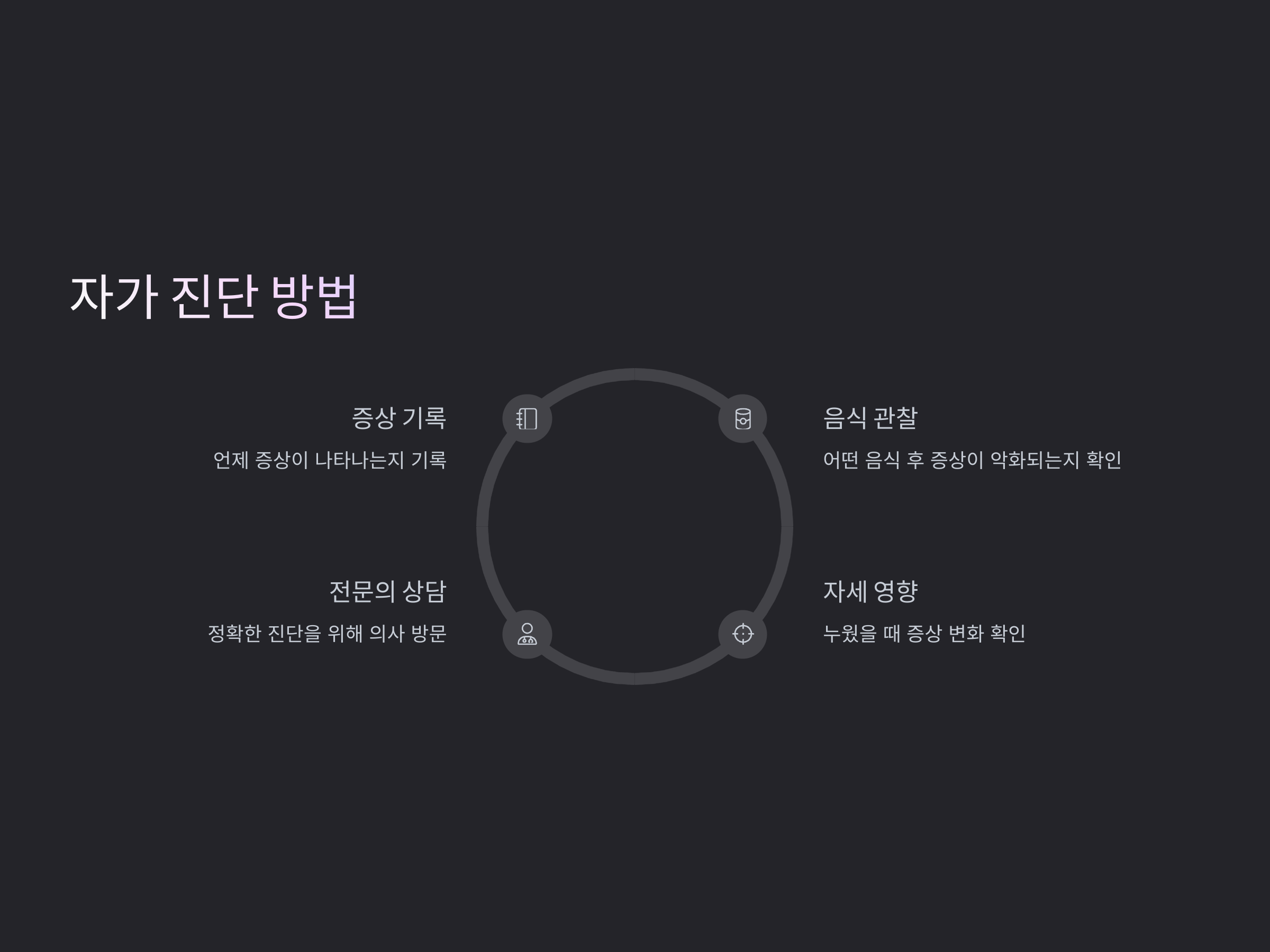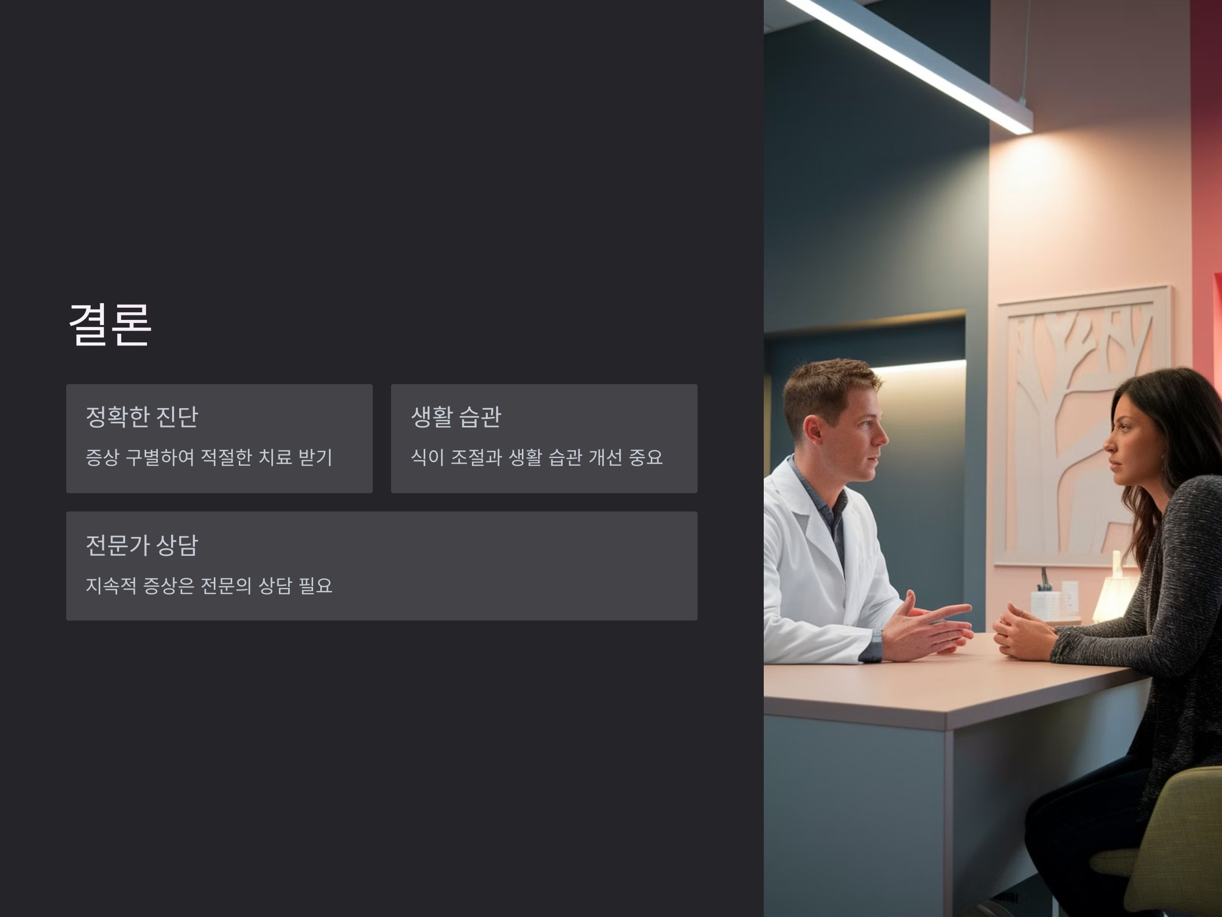이 두 가지 질환을 구별하기 위해서는 자신이 경험하는 증상과 생활 습관을 잘 살펴보는 것이 중요합니다. 예를 들어, 특정 음식 후에만 증상이 나타난다면 담낭 기능 저하를 의심할 수 있고, 가슴 쓰림이나 속쓰림이 동반된다면 위식도 역류질환을 의심할 수 있습니다.