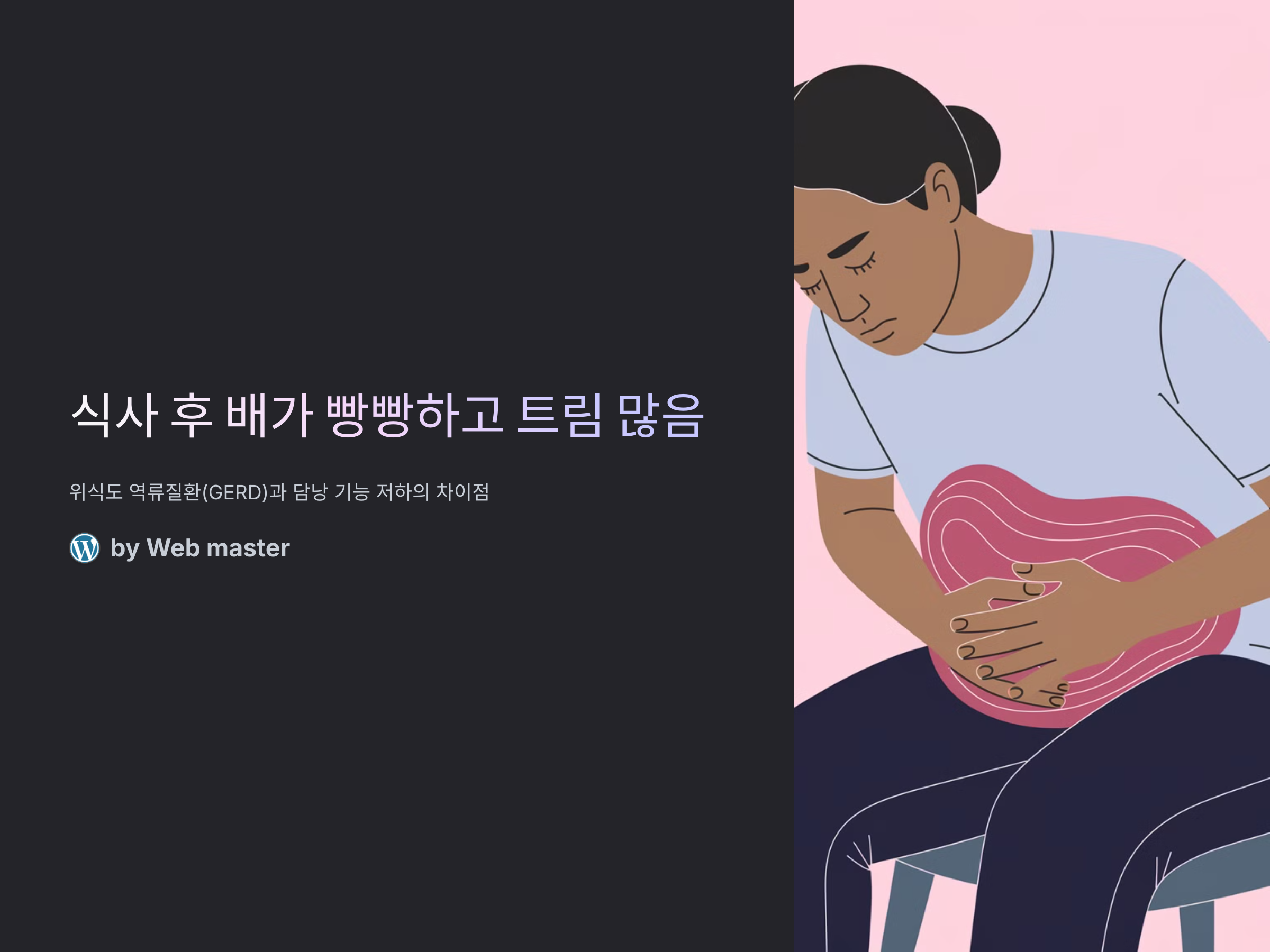 식사 후 배가 빵빵하고 트림이 자주 나는 증상은 많은 사람들이 경험하는 불편한 증상입니다. 이럴 때, 두 가지 주요 원인인 위식도 역류질환(GERD)과 담낭 기능 저하가 의심될 수 있습니다. 두 질환은 비슷한 증상을 나타낼 수 있지만, 그 원인과 치료 방법은 매우 다릅니다. 이번 포스팅에서는 두 가지 질환의 차이점과 증상, 그리고 어떻게 구별할 수 있는지에 대해 알아보겠습니다.