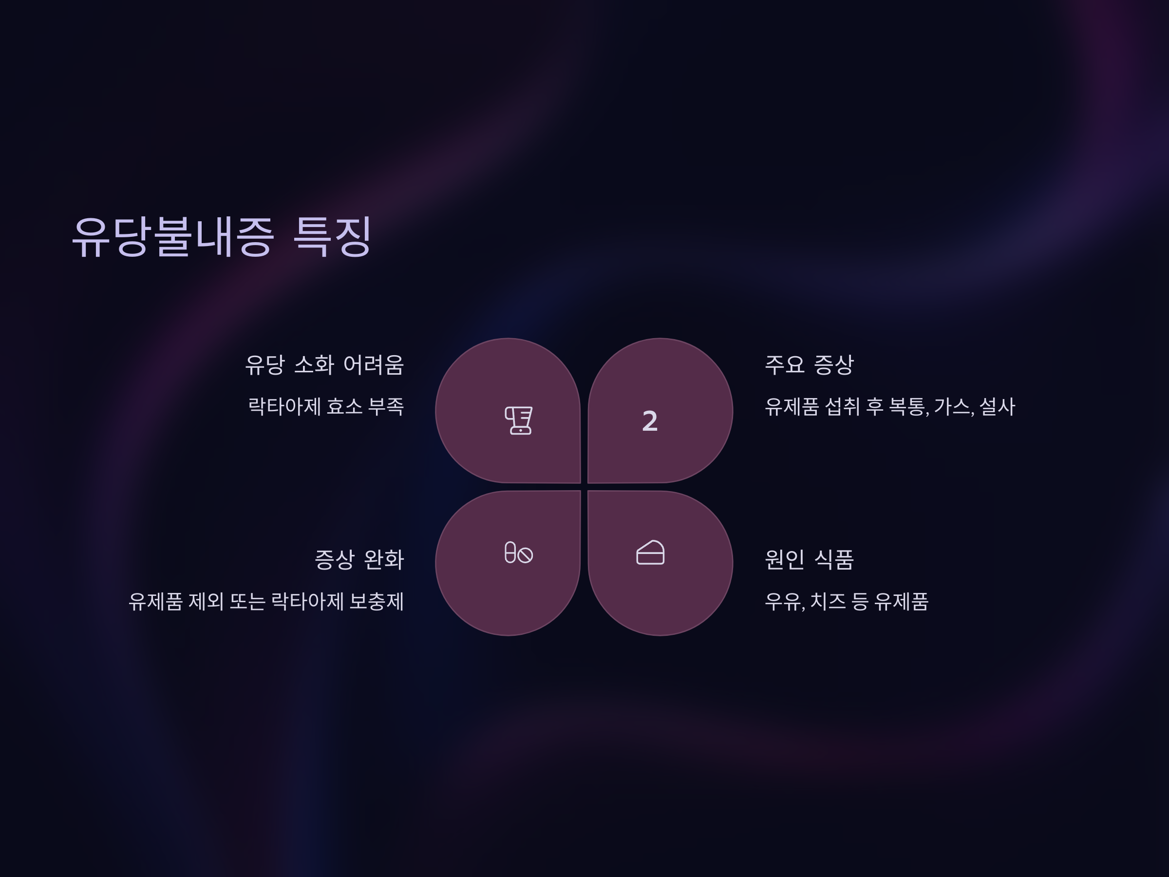 유당불내증은 우유나 유제품에 포함된 유당을 소화하는 데 어려움을 겪는 상태입니다. 유당불내증을 가진 사람들은 유당을 소화하는 데 필요한 효소인 락타아제가 부족하거나 기능이 떨어져 있어, 유제품을 섭취한 후 복부 불편함을 느끼게 됩니다. 유당불내증은 식사 후 배에서 꾸르륵 소리가 나고, 복통, 설사 등을 유발할 수 있습니다.