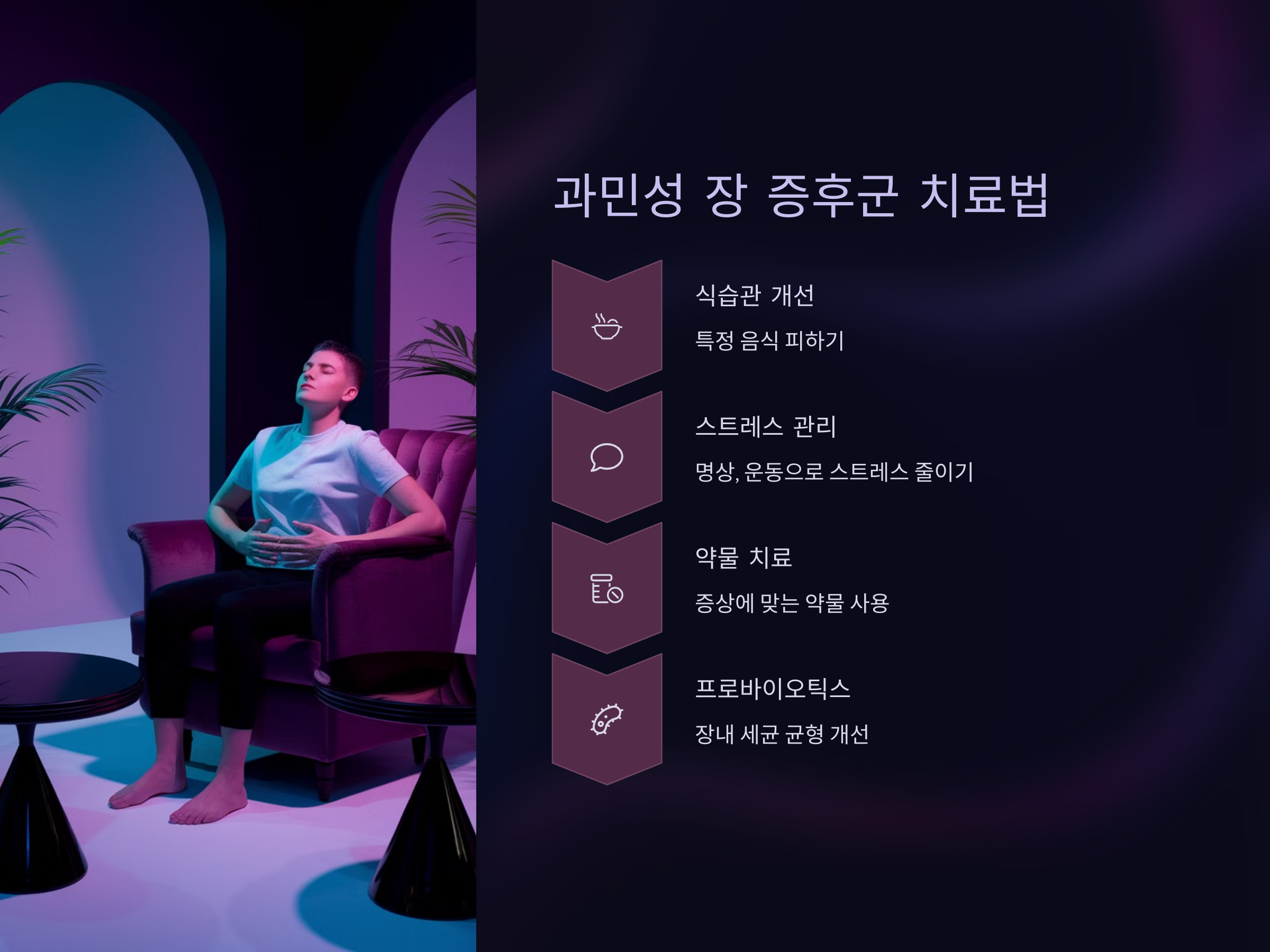 반면, IBS의 치료는 증상에 맞게 다양합니다. 스트레스 관리, 식습관 개선, 특정 음식을 피하는 등의 방법이 있습니다. 또한, 약물 치료나 프로바이오틱스, 섬유질 보충제 등을 사용하여 증상을 완화할 수 있습니다.