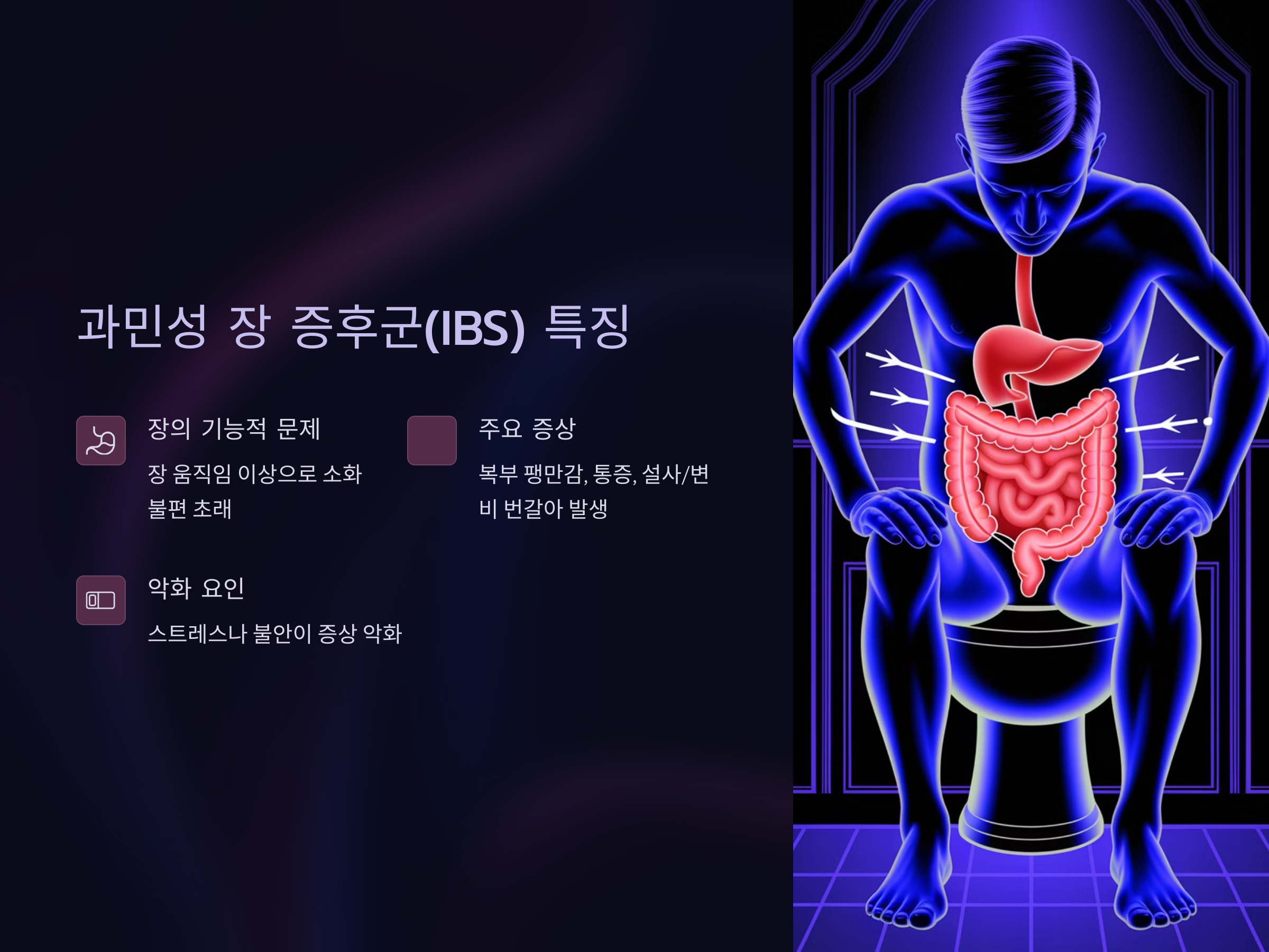 - IBS는 다양한 음식이나 스트레스가 원인이 되어 증상이 나타날 수 있으며, 장의 기능적 문제로 발생합니다.