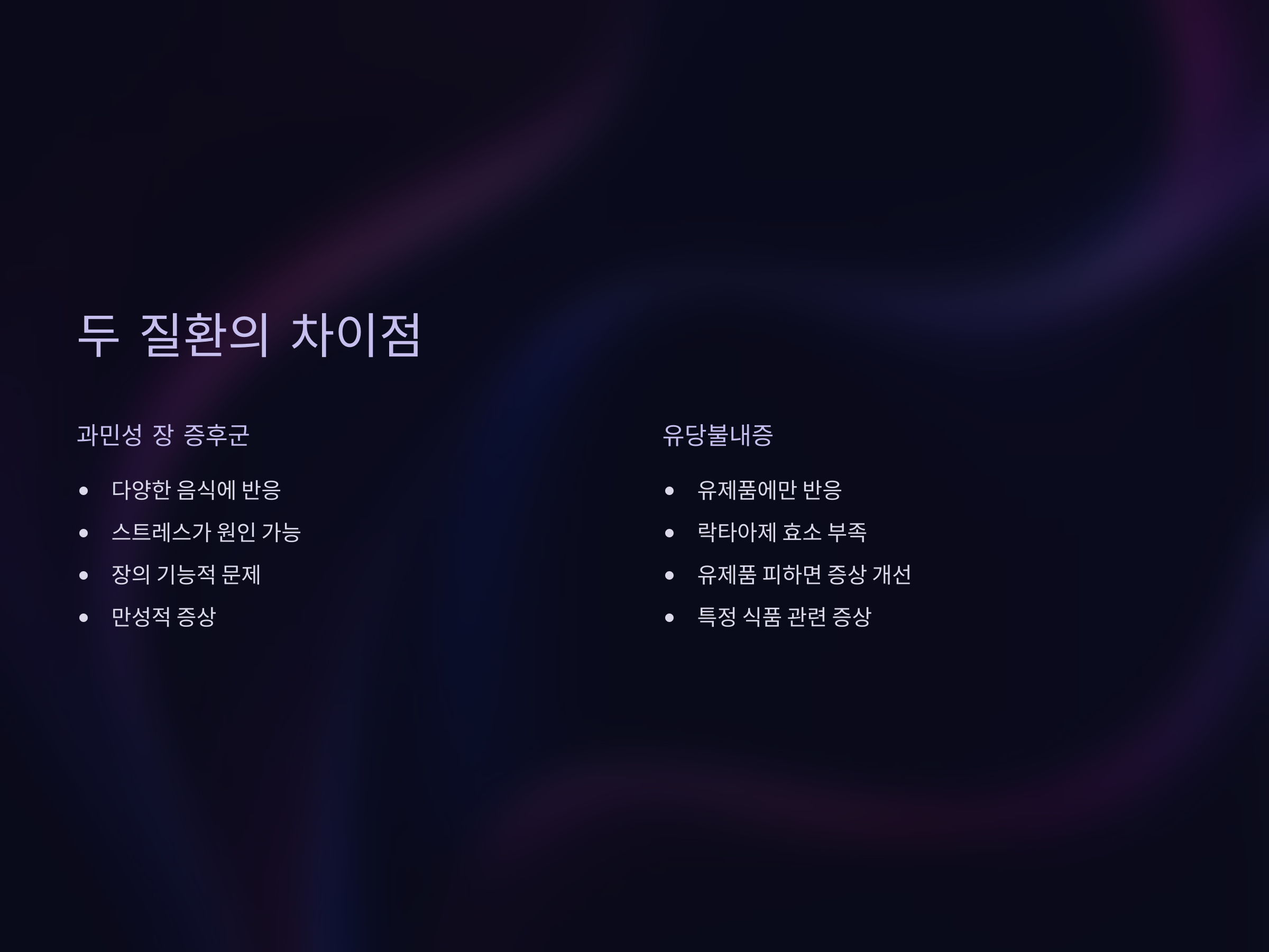 유당불내증은 락타아제가 부족하거나 기능이 떨어져 생기는 질환으로, 유제품을 완전히 제외하거나 락타아제가 포함된 보충제를 복용하여 증상을 완화할 수 있습니다. 유당불내증은 IBS와 달리 유제품에만 반응하는 특이한 증상 패턴을 보입니다.