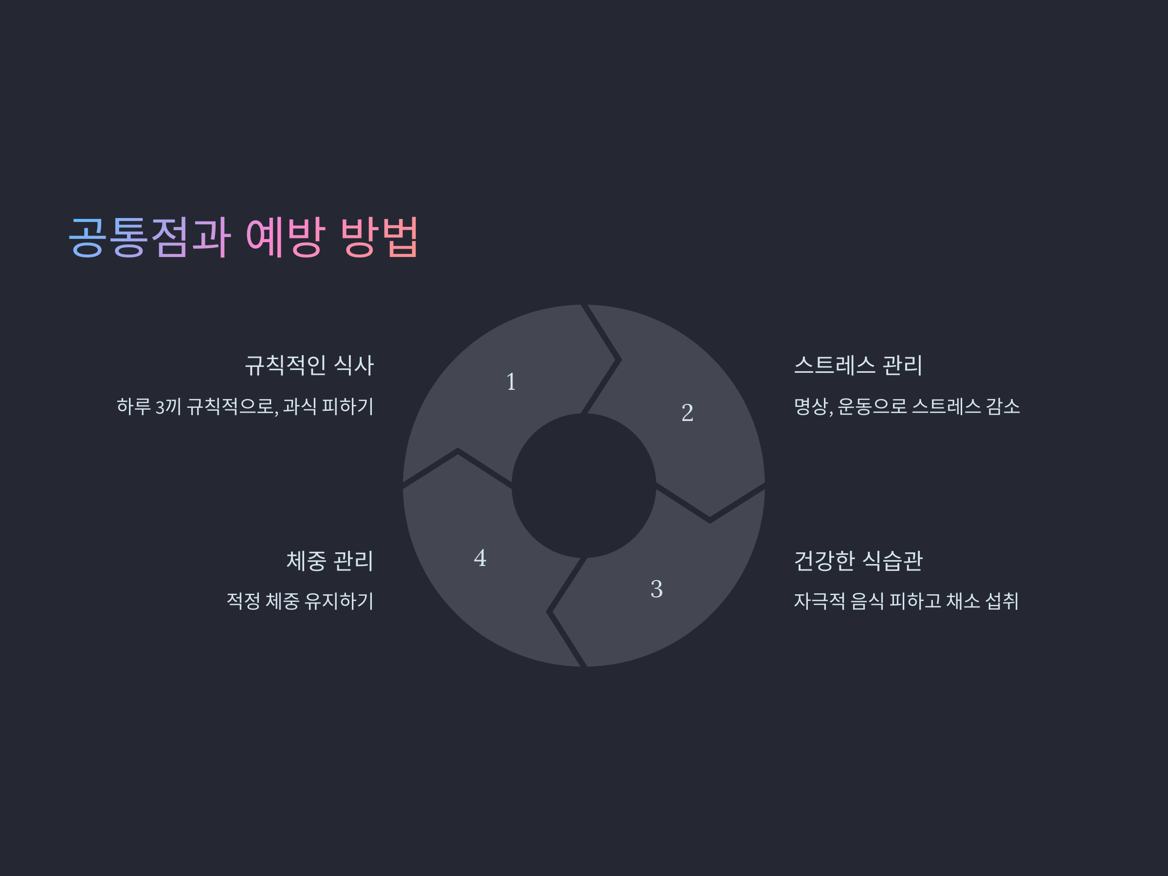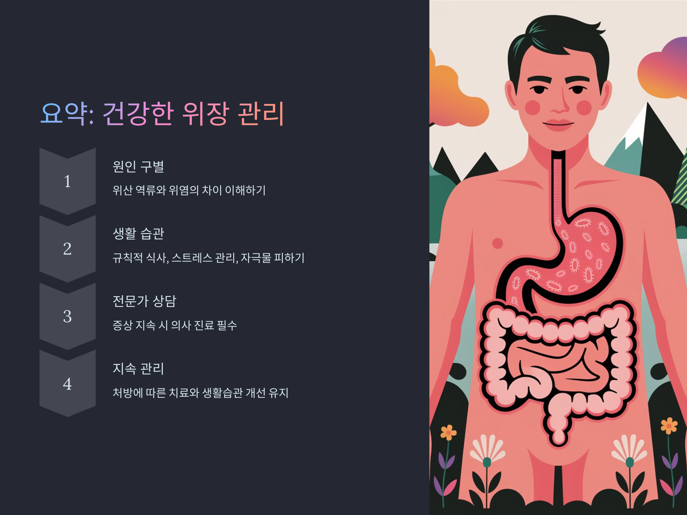 - 체중 관리: 비만은 위산 역류와 위염을 악화시킬 수 있으므로 체중 관리가 필요합니다.