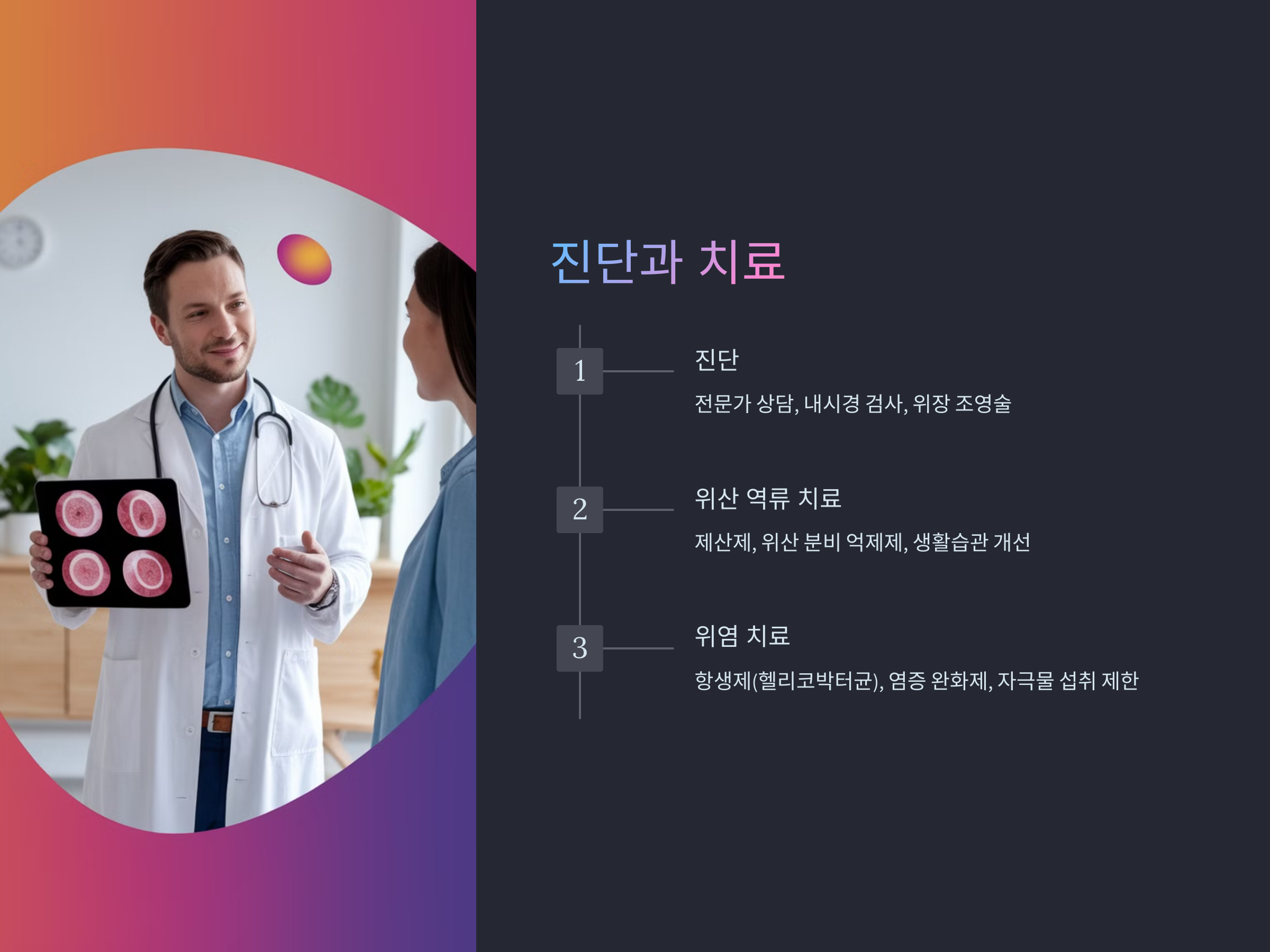 - 위산 역류: 위산을 중화시키는 제산제나, 위산 분비를 억제하는 약물을 처방받을 수 있습니다.