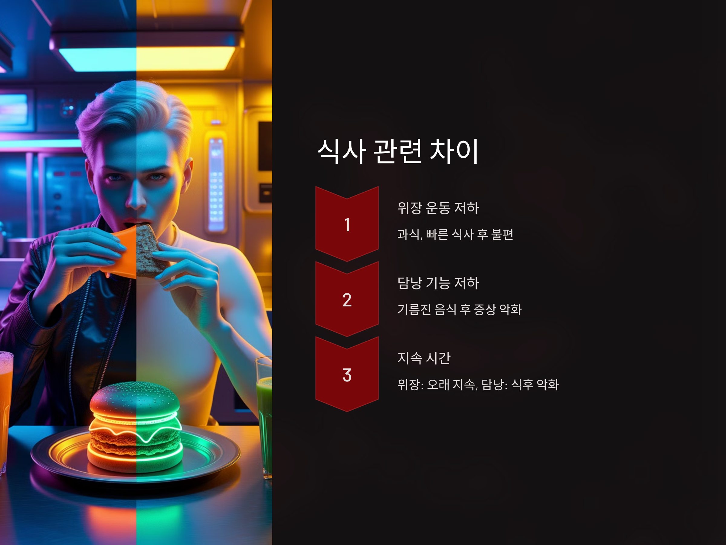 - 위장 운동 저하: 빠르게 식사를 하거나 과식을 했을 때 불편함이 심해지며, 식사 후 시간이 지나도 증상이 지속될 수 있습니다.