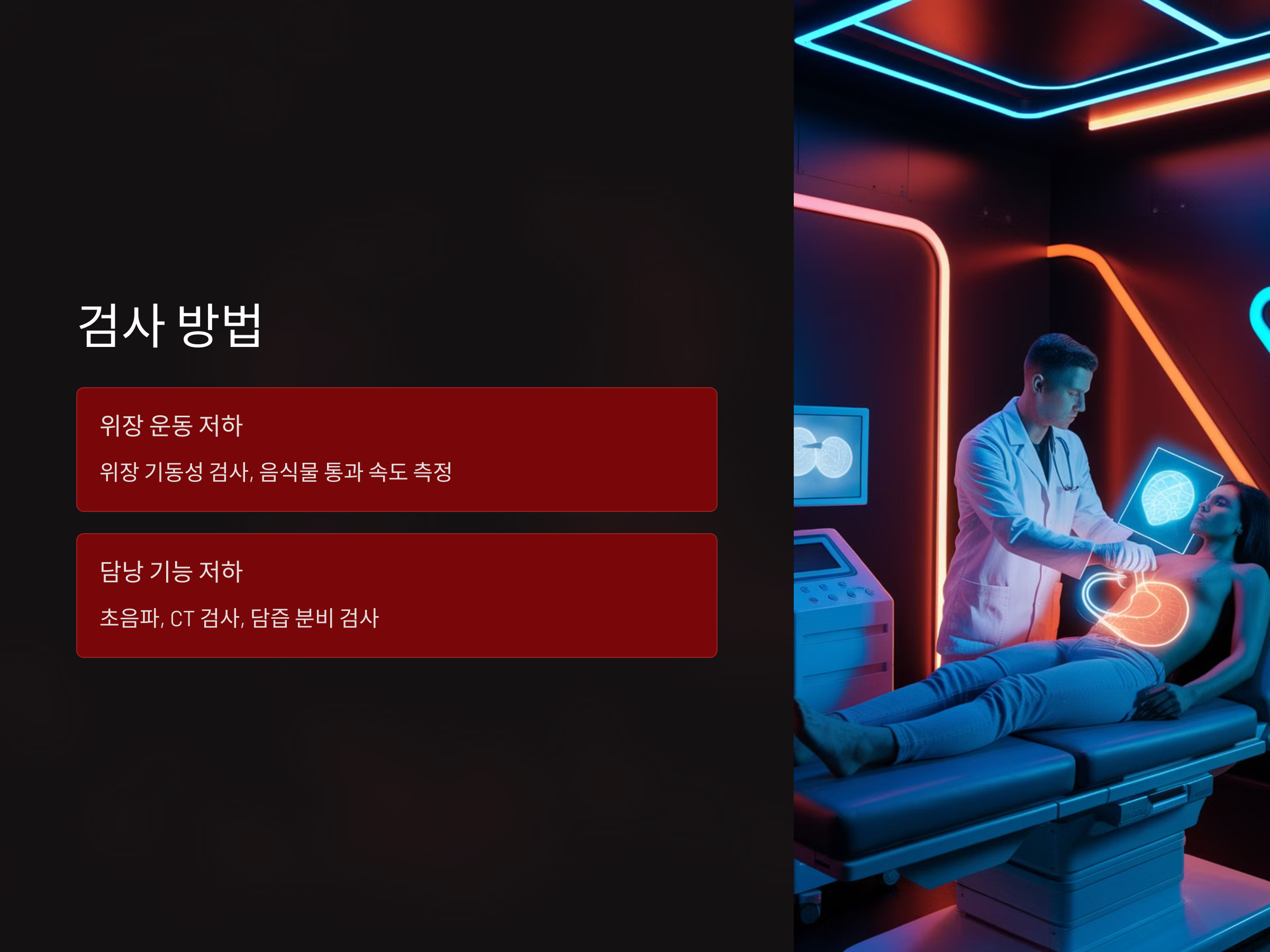 - 담낭 기능 저하: 초음파나 CT 검사로 담석 여부를 확인할 수 있으며, 담즙 분비가 정상적인지 확인하는 검사가 필요합니다.