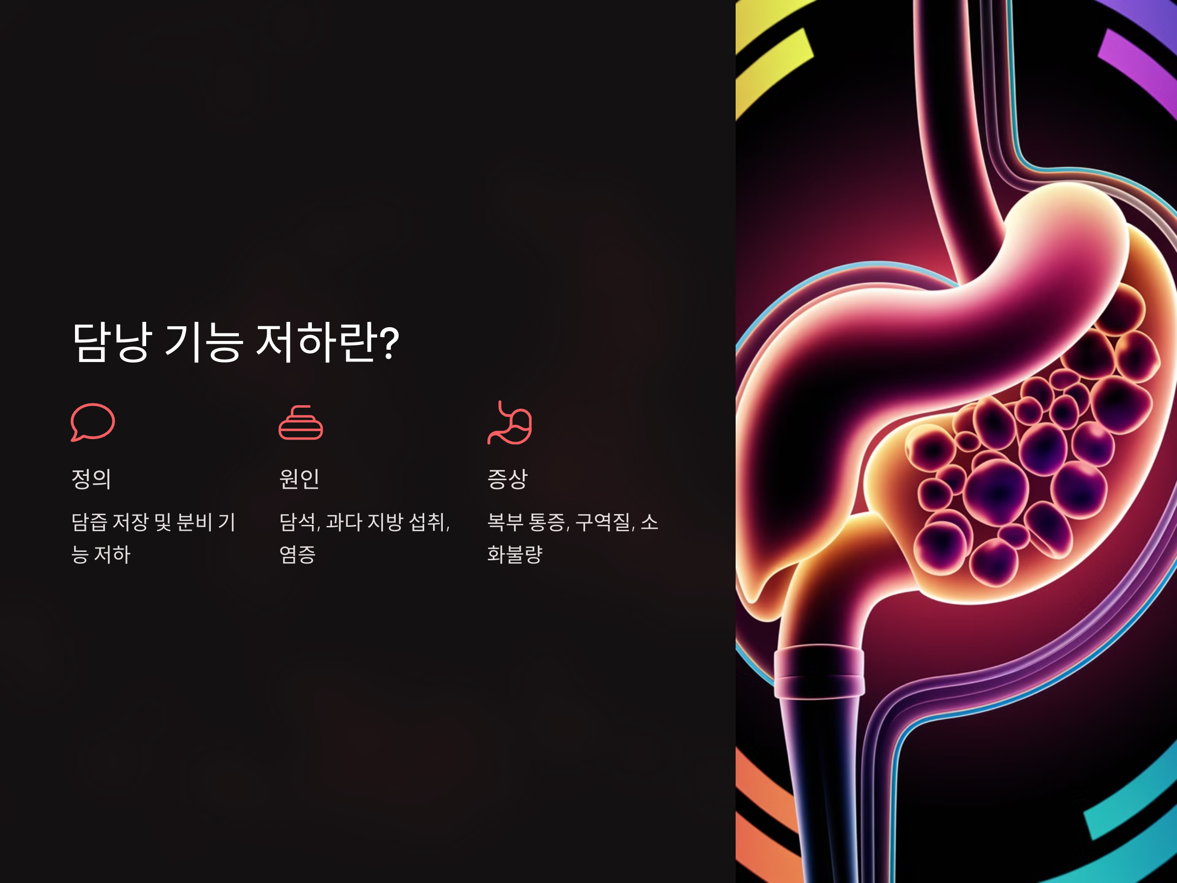 - 담낭 기능 저하: 기름지거나 지방이 많은 음식을 섭취한 후에 특히 증상이 악화되며, 담즙이 제대로 분비되지 않아 지방 소화에 문제가 생깁니다.