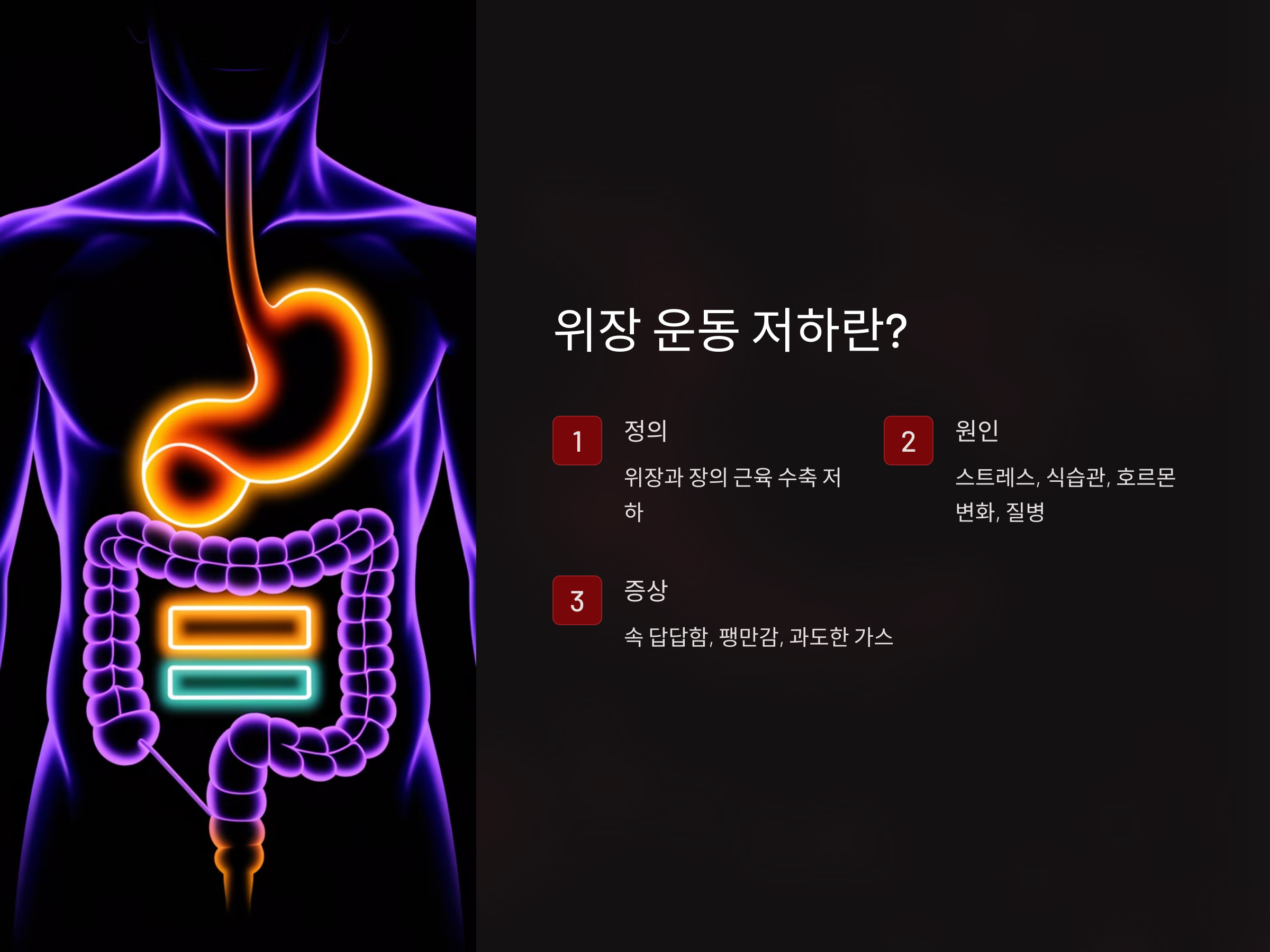 위장 운동 저하란, 위장과 장의 근육이 정상적으로 수축하지 못해 음식물이 소화기관을 통과하는 속도가 느려지는 상태를 말합니다. 이로 인해 속이 답답하고, 가스가 차며, 복부 팽만감을 느낄 수 있습니다.