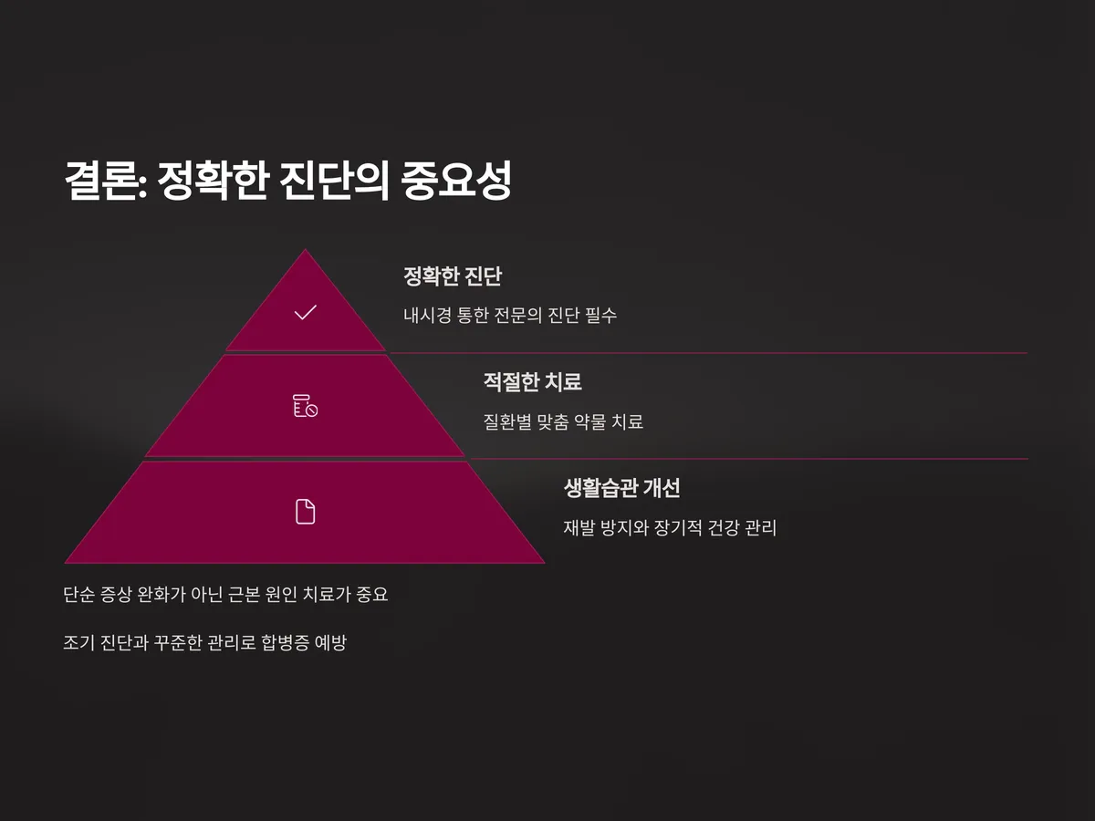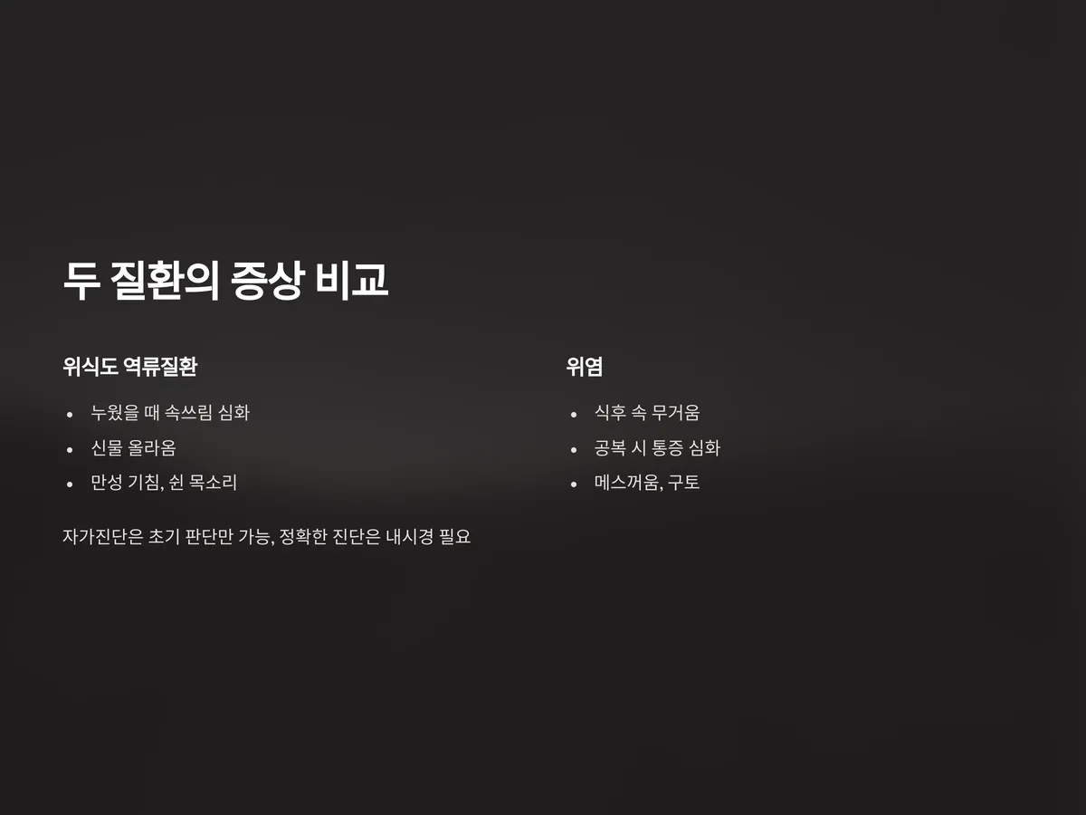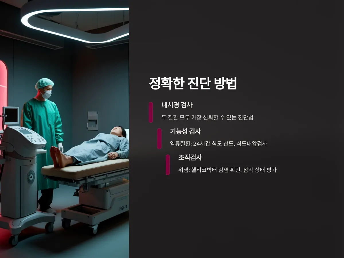 자가진단은 초기 판단에는 도움이 되지만 정확한 구분을 위해서는 위내시경 검사를 통한 전문의 진단이 반드시 필요합니다. 두 질환이 동시에 존재할 수도 있으므로, 단순히 증상만으로 판단하는 것은 위험합니다.