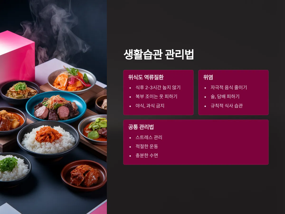 위염의 경우에는 자극적인 음식, 탄산, 술, 담배는 반드시 줄여야 하며, 소화에 부담을 주지 않는 식단 유지가 중요합니다. 특히 규칙적인 식사 습관은 위 점막 회복에 도움이 되며, 스트레스를 줄이기 위한 운동이나 명상도 효과적입니다.