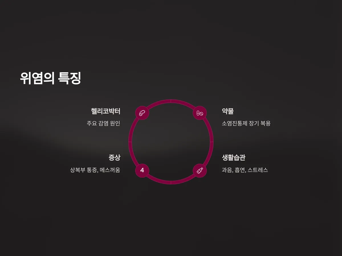 위염(Gastritis)은 위 점막에 염증이 생기는 질환으로 급성과 만성 형태로 나뉘며, 원인도 매우 다양합니다. 헬리코박터 파일로리 감염, 비스테로이드성 소염진통제(NSAIDs)의 장기 복용, 과음, 흡연, 만성 스트레스가 주요 원인으로 작용합니다.