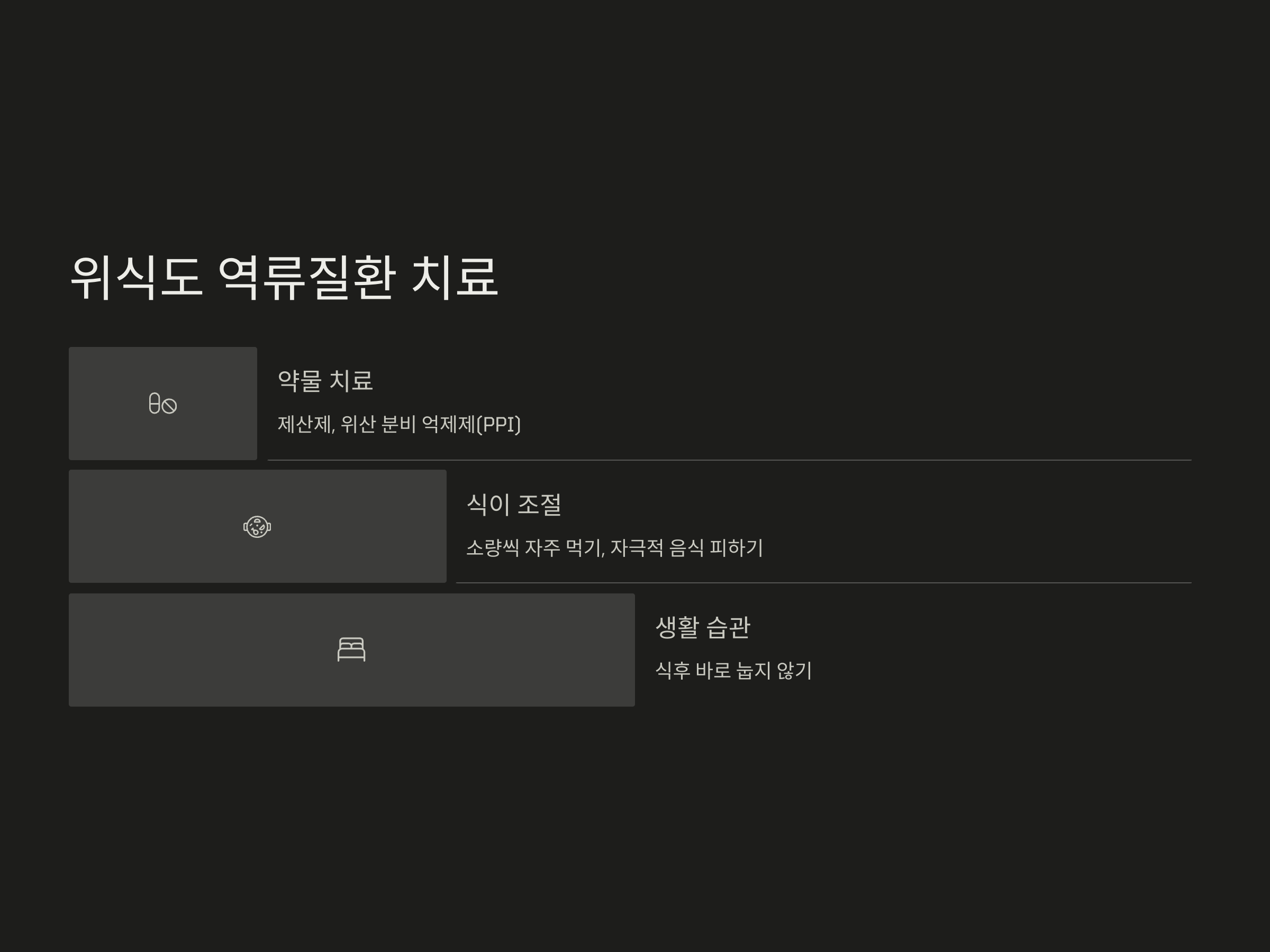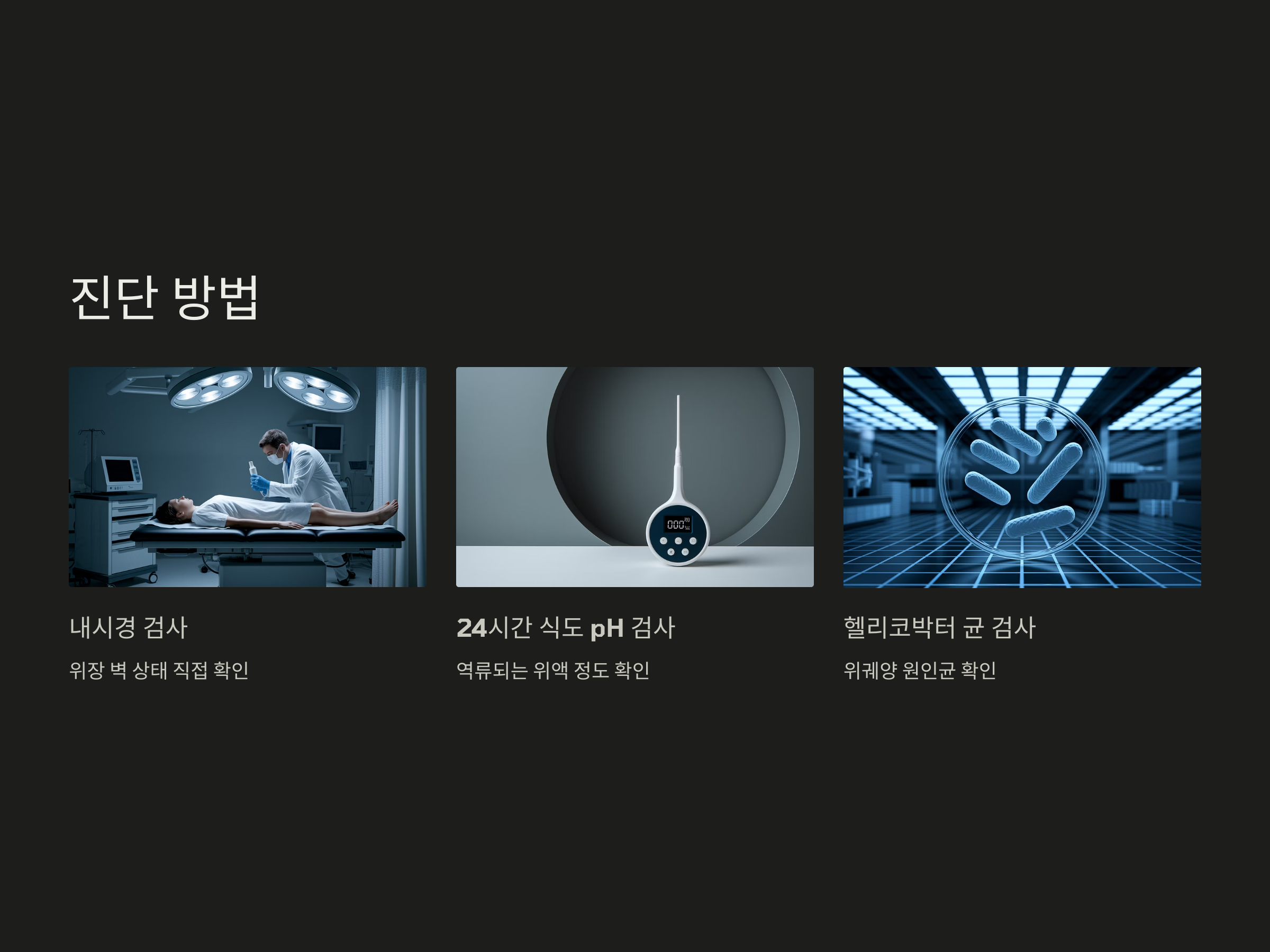 - 약물 치료: 위산을 중화시키는 제산제나 위산 분비를 억제하는 약물(PPI 등)을 사용합니다.