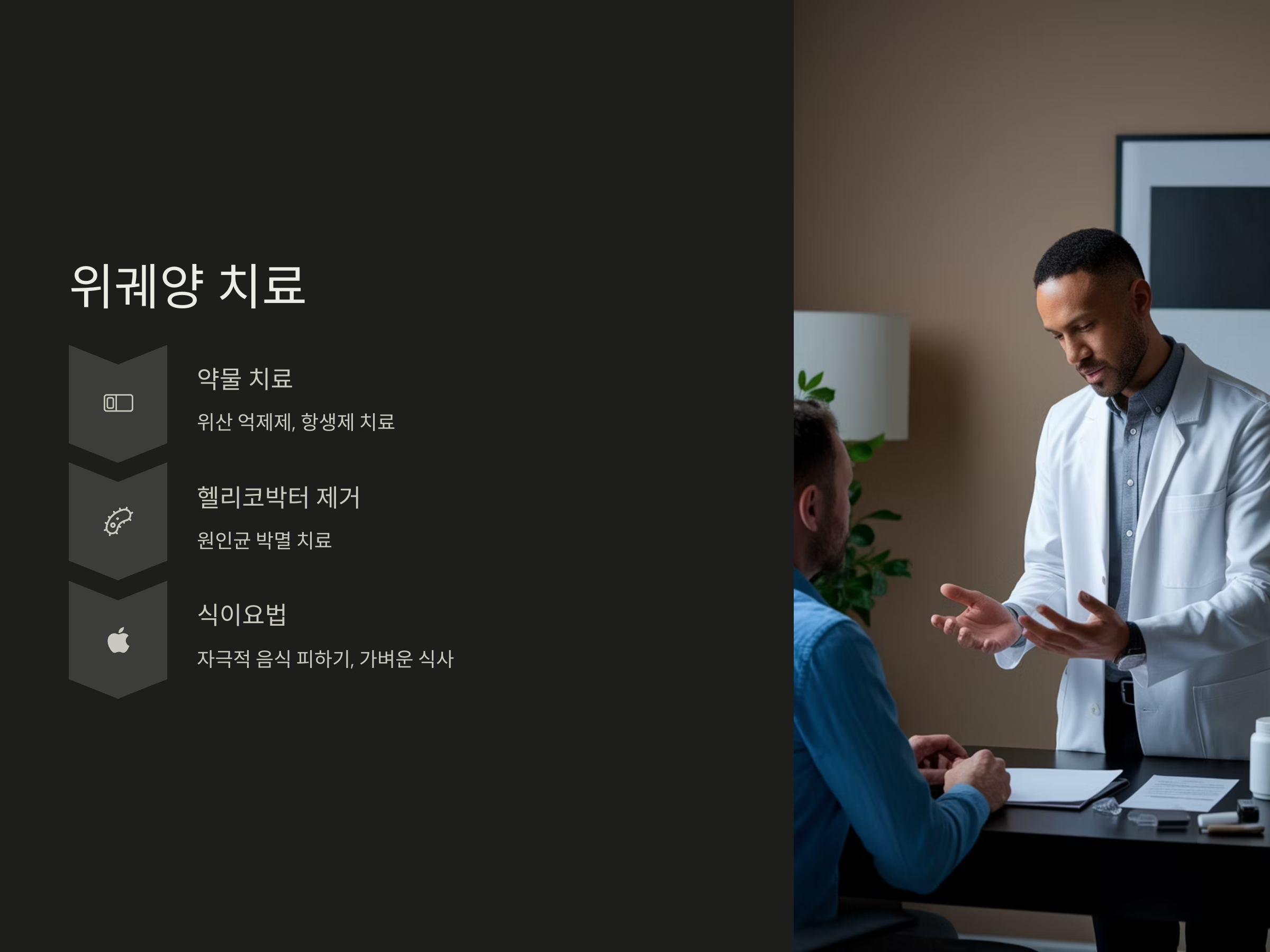 - 약물 치료: 위산을 억제하는 약물과 함께 헬리코박터 파일로리균에 대한 항생제 치료가 필요할 수 있습니다.