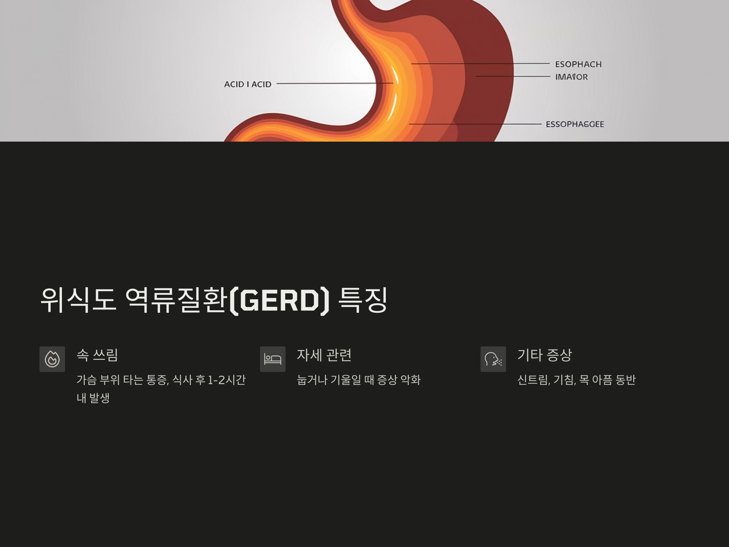 - 속 쓰림: 가슴 부위에서 느껴지는 타는 듯한 통증이 특징입니다. 일반적으로 식사 후 1~2시간 내에 발생하며, 특히 눕거나 기울어질 때 더 심해질 수 있습니다.