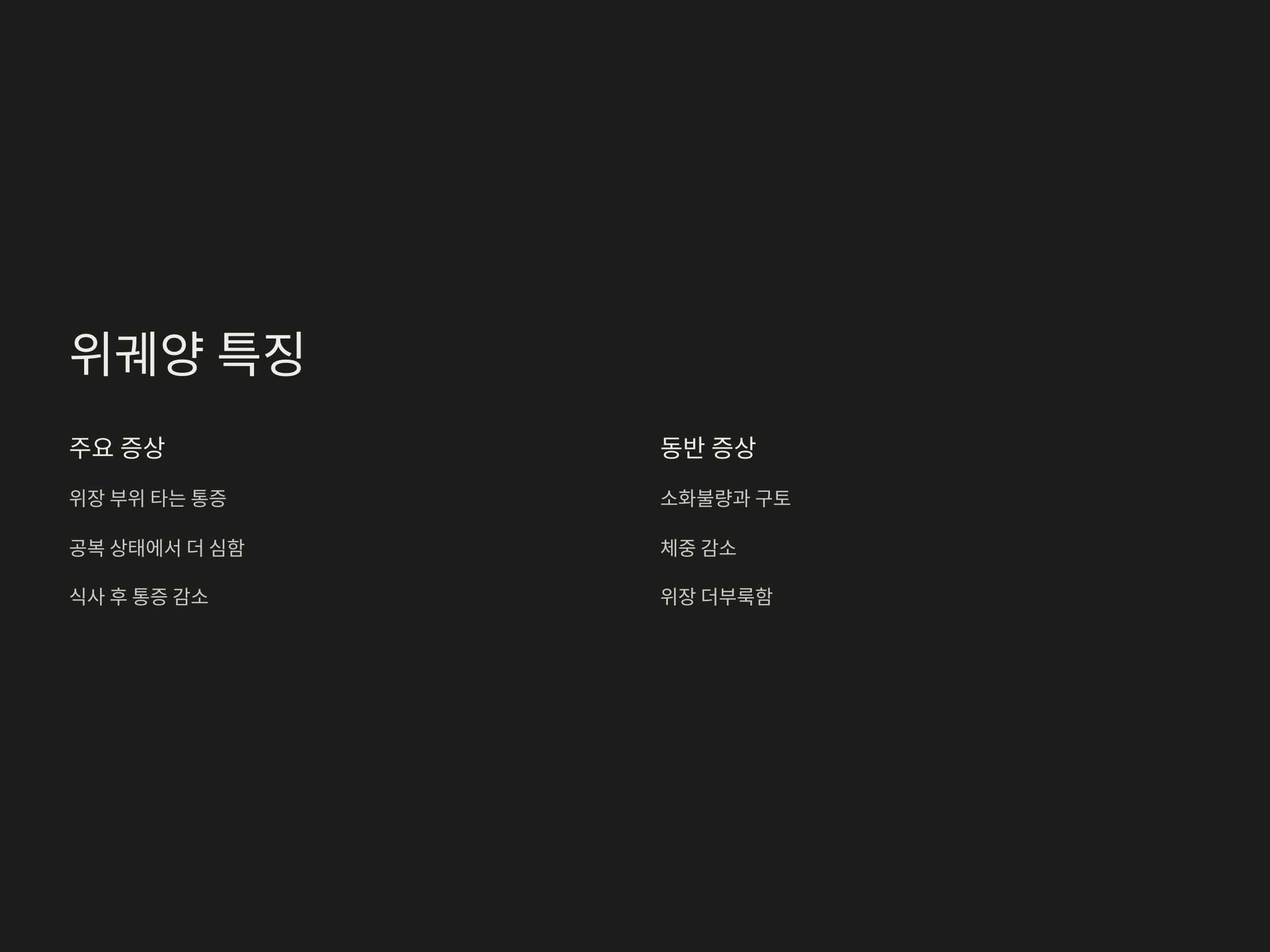 - 식사 후 통증 감소: 위장에 음식이 들어가면 위액의 자극이 줄어들기 때문에 위궤양 환자는 식사 후 증상이 완화되는 경향이 있습니다.
