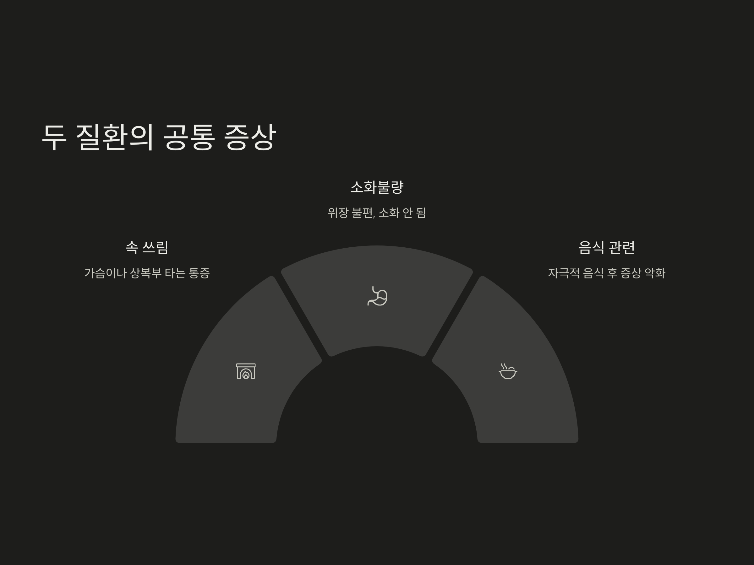 - 속 쓰림: 두 질환 모두 가슴이나 상복부에서 타는 듯한 통증을 유발할 수 있습니다.