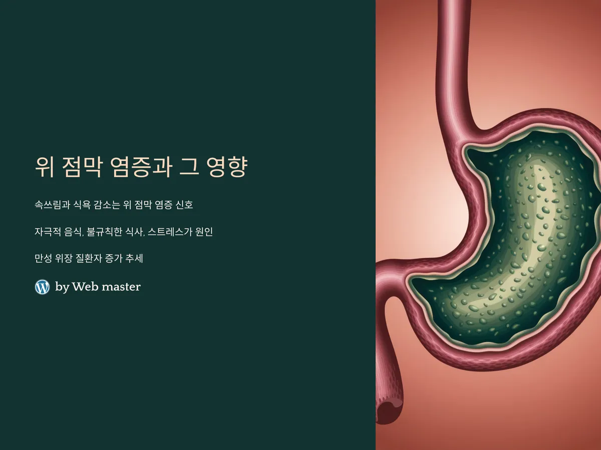 속이 자주 쓰리고 식욕이 줄어든다면, 단순한 체력 저하나 스트레스 때문만은 아닐 수 있습니다. 반복적으로 느껴지는 속쓰림과 식욕 부진은 위 점막에 염증이 생겨 위 기능이 저하되고 있다는 신호일 가능성이 큽니다. 특히 최근에는 자극적인 음식 섭취, 불규칙한 식사, 스트레스와 함께 과도한 약물 복용 등이 복합적으로 작용하면서 만성 위장 질환자가 증가하고 있습니다. 2025년 현재, 의료계에서는 이 같은 증상을 단순한 위염으로 보기보다 ‘기능성 소화불량’ 또는 ‘만성 위축성 위염’으로 구분하고 있으며, 이는 헬리코박터균 감염이나 자가면역 반응과도 관련이 있다는 연구 결과도 지속적으로 발표되고 있습니다. 본 포스팅에서는 이 같은 증상이 지속될 경우 어떤 위험이 있는지, 어떻게 예방하고 개선할 수 있는지, 위 점막 재생에 도움을 줄 수 있는 식습관과 실질적인 치료 방법에 대해 자세히 살펴보겠습니다.