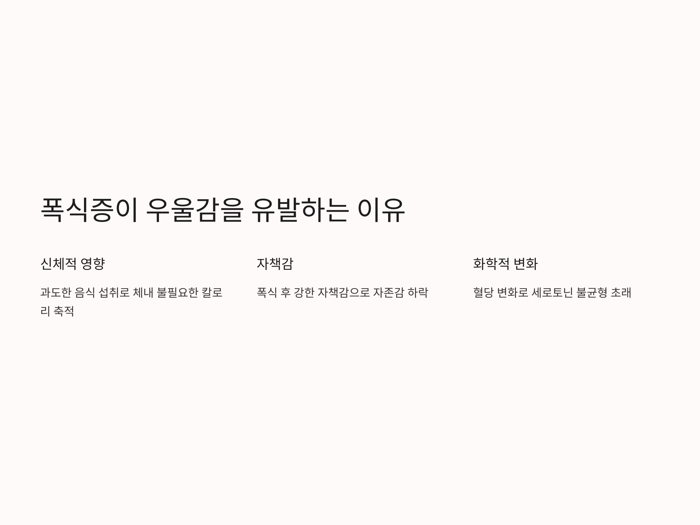폭식증을 겪는 사람들은 일반적으로 체중에 대한 불안감을 가지고 있으며, 이를 해결하려는 시도로 폭식을 반복합니다. 그러나 폭식은 문제를 해결하는 방법이 아니라, 오히려 상황을 악화시키는 결과를 낳습니다. 폭식이 반복될수록 자신에 대한 부정적인 인식과 자책감은 더욱 깊어지고, 이는 우울감을 유발하는 주요 요인이 됩니다.