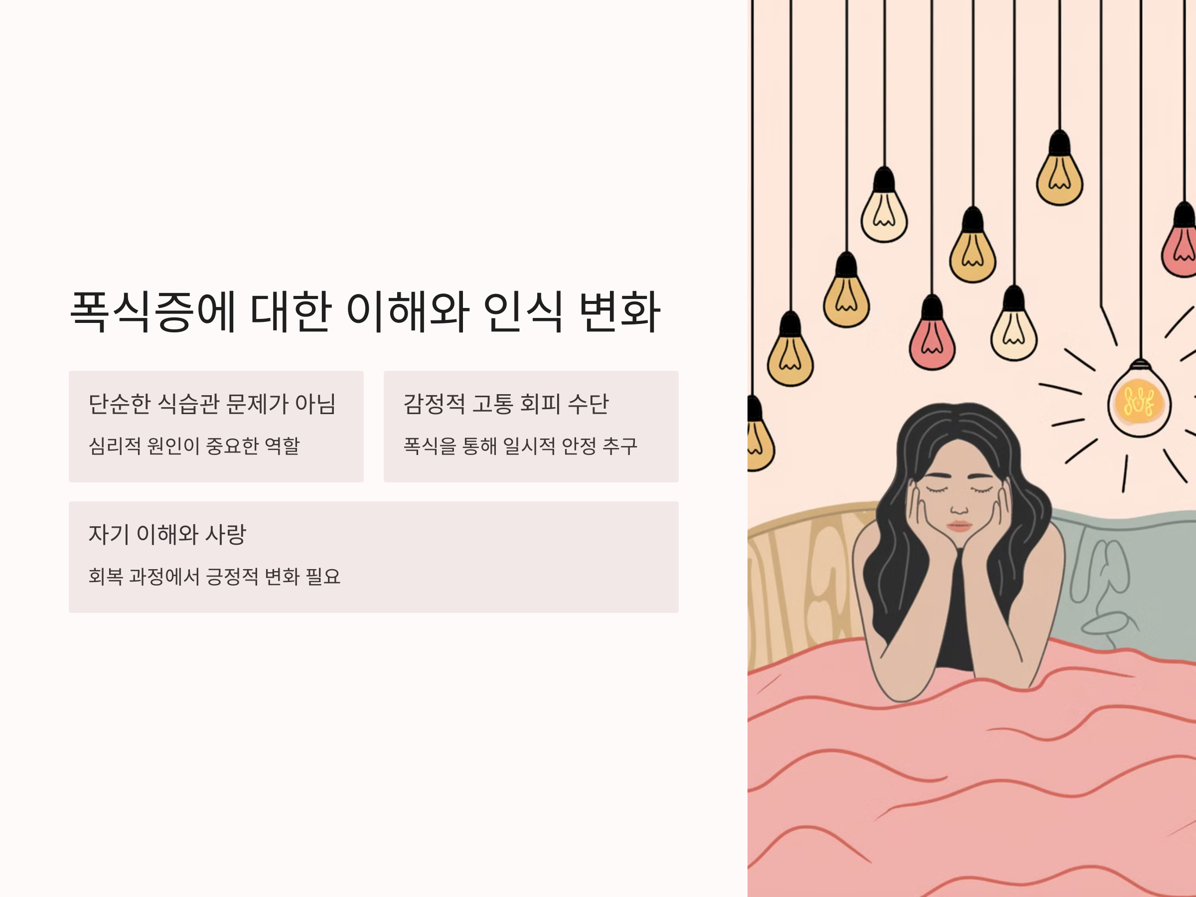 폭식증과 우울감을 동시에 다루는 것이 필요합니다. 이는 신체적, 정신적 회복을 동시에 이루는 과정입니다. 폭식증