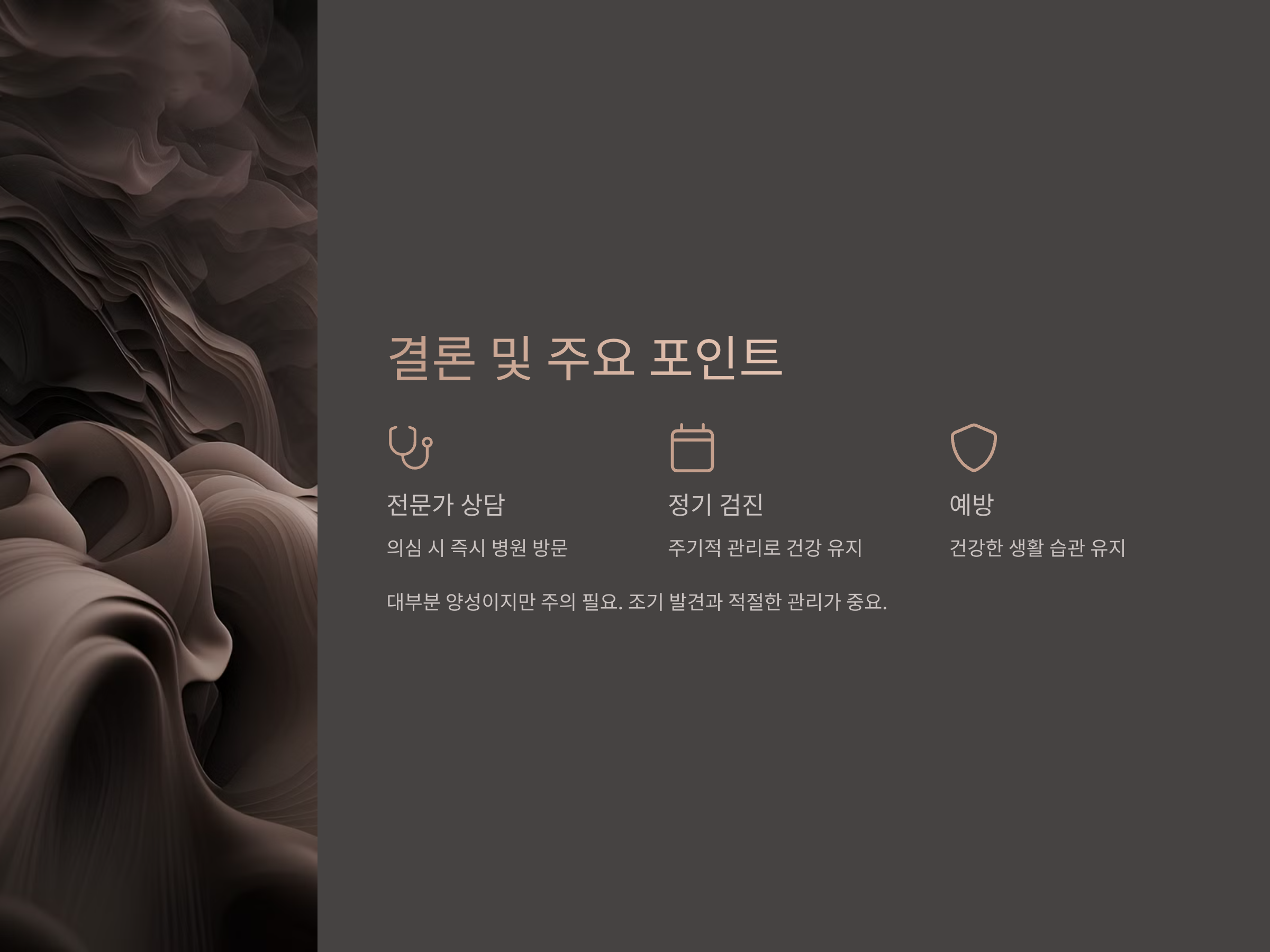 신경섬유종은 대부분 양성 종양으로 큰 문제가 되지 않지만, 그 크기나 위치에 따라 치료가 필요할 수 있습니다. 피부에 신경섬유종이 발생하면, 무리하지 않고 전문가의 상담을 받는 것이 중요합니다. 주기적인 관리와 검진을 통해 신경섬유종의 상태를 체크하고, 적절한 치료를 받으면 큰 문제 없이 관리할 수 있습니다. 이 글을 통해 신경섬유종에 대한 기본적인 정보를 알게 되었기를 바랍니다.