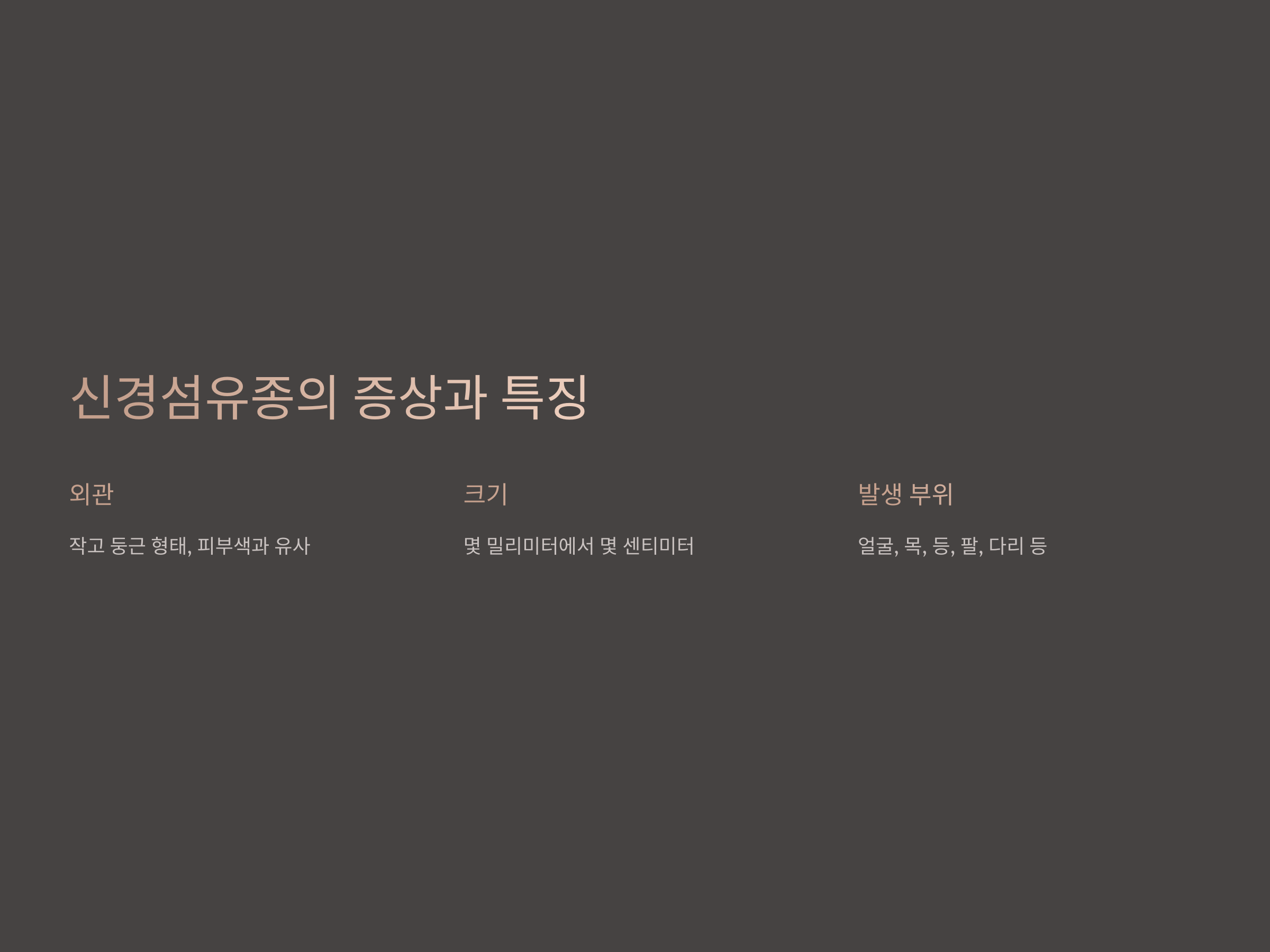 신경섬유종은 대부분 피부 표면에 작고 둥근 형태로 나타나며, 피부색과 비슷한 색을 띠거나 약간 어두운 색을 띨 수 있습니다. 종양의 크기는 보통 몇 밀리미터에서 몇 센티미터 정도로 다양하지만, 대부분은 그 자체로 통증을 일으키지 않습니다. 그러나 몇몇 경우에는 통증이나 가려움증을 동반할 수 있습니다.