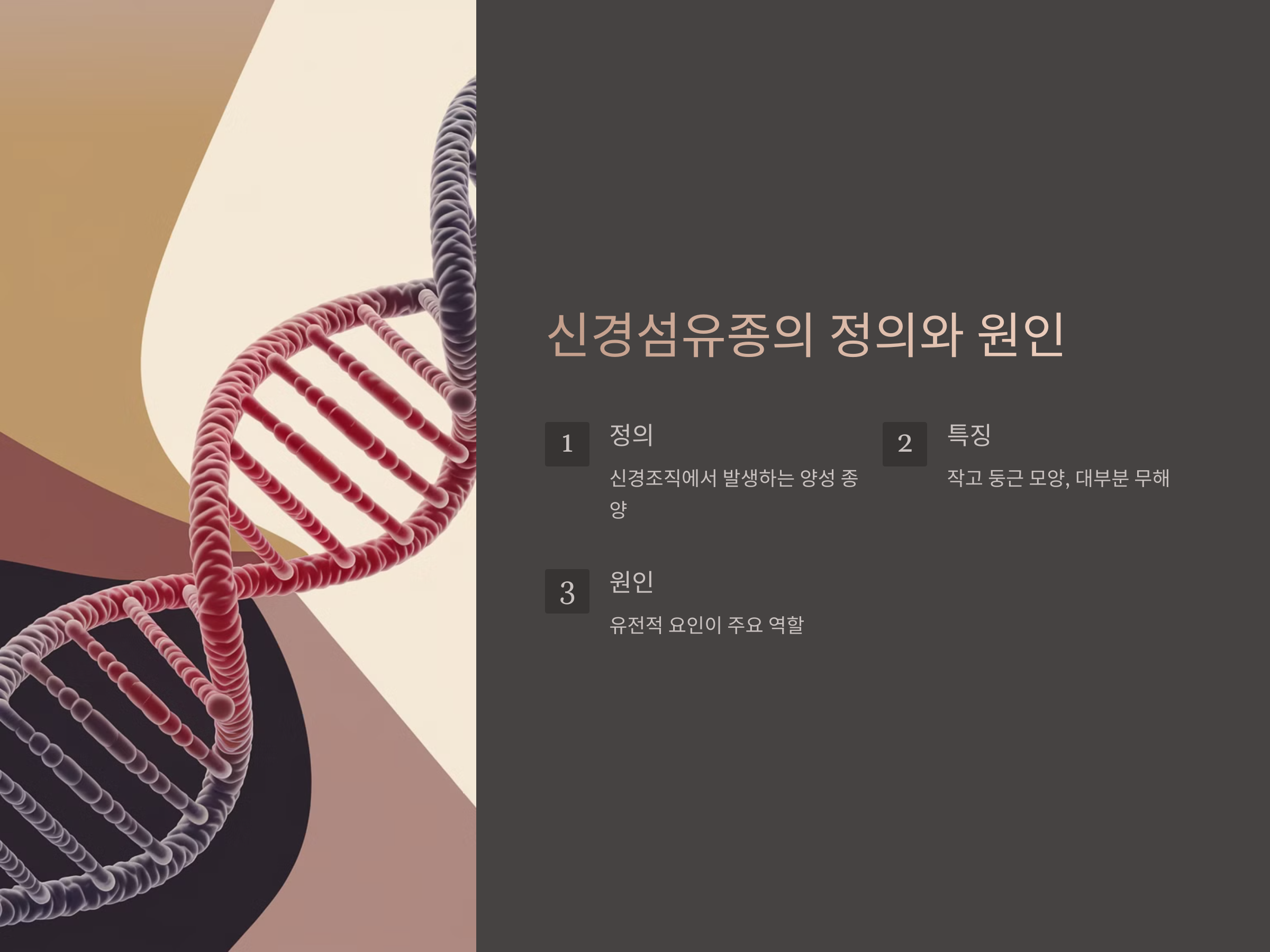 신경섬유종은 신경조직에서 발생하는 양성 종양으로, 주로 피부에서 나타나는 경우가 많습니다. 이 종양은 대부분이 신경섬유 세포에서 발생하며, 일반적으로 크기가 작고 둥근 모양을 가집니다. 신경섬유종은 그 자체로는 위험하지 않지만, 위치나 개수에 따라 미용적 문제나 통증을 유발할 수 있습니다.