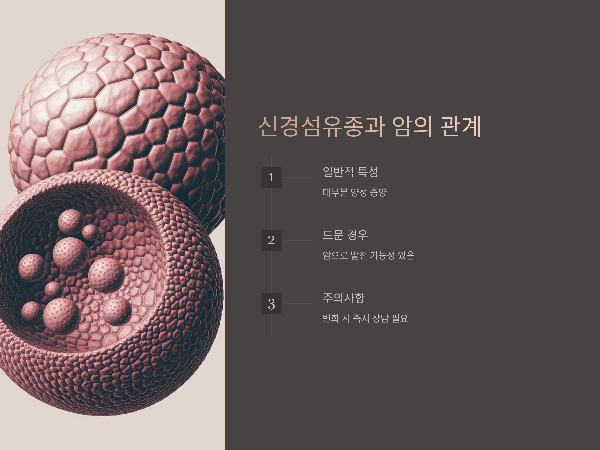 일반적으로 신경섬유종은 양성 종양으로, 암과는 관련이 없습니다. 그러나 드물게 신경섬유종이 암으로 발전하는 경우가 있을 수 있으므로, 종양의 변화가 있다면 즉시 전문가에게 상담을 받는 것이 중요합니다.