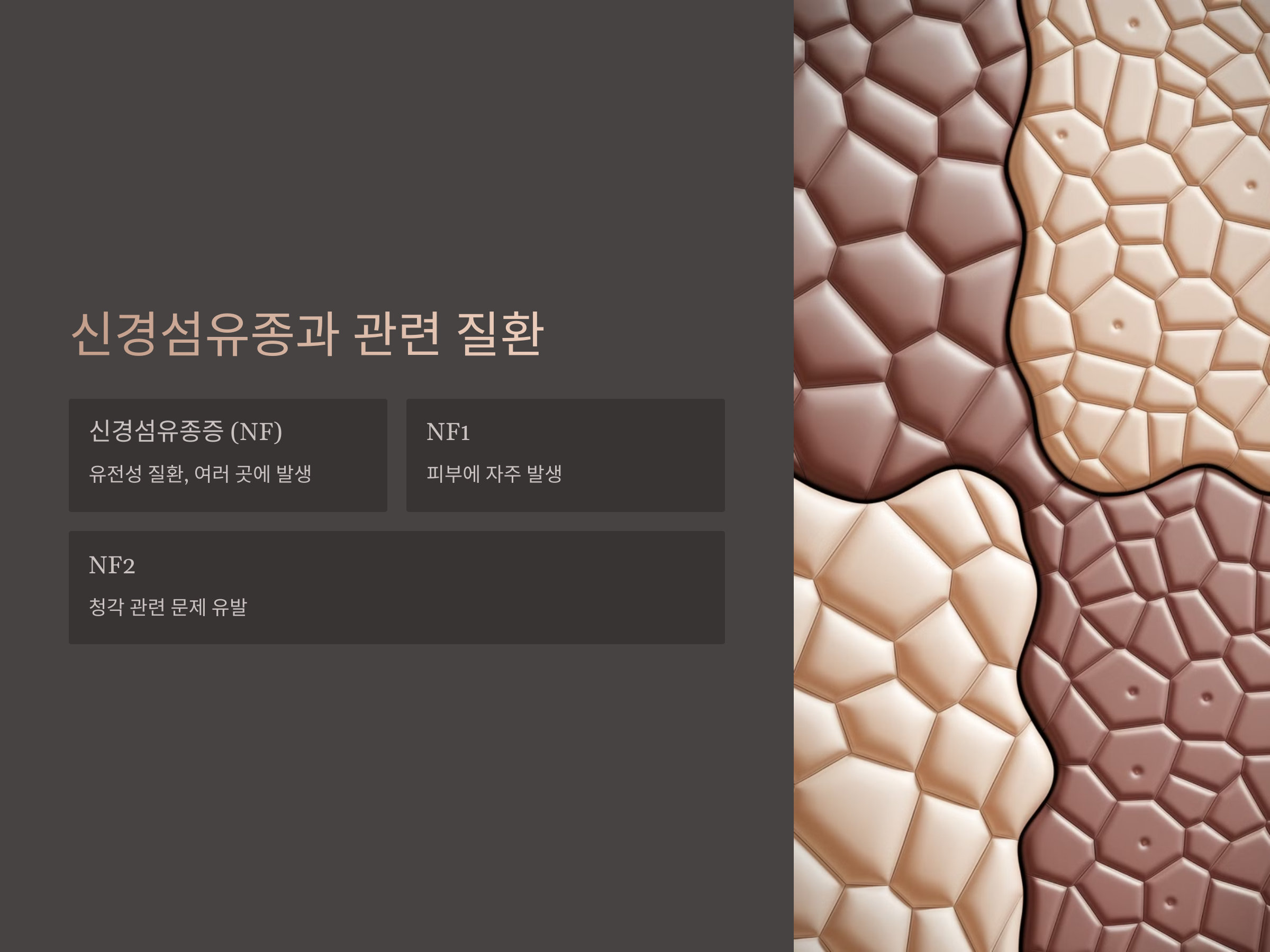신경섬유종증(NF)은 신경섬유종이 여러 곳에서 발생하는 유전성 질환을 말합니다. NF1(1형 신경섬유종증)은 피부에 신경섬유종이 자주 발생하며, NF2(2형 신경섬유종증)은 주로 청각과 관련된 문제를 일으킵니다. NF가 있는 경우, 신경섬유종은 여러 곳에서 발생할 수 있으며, 정기적인 검진과 관리가 필요합니다.