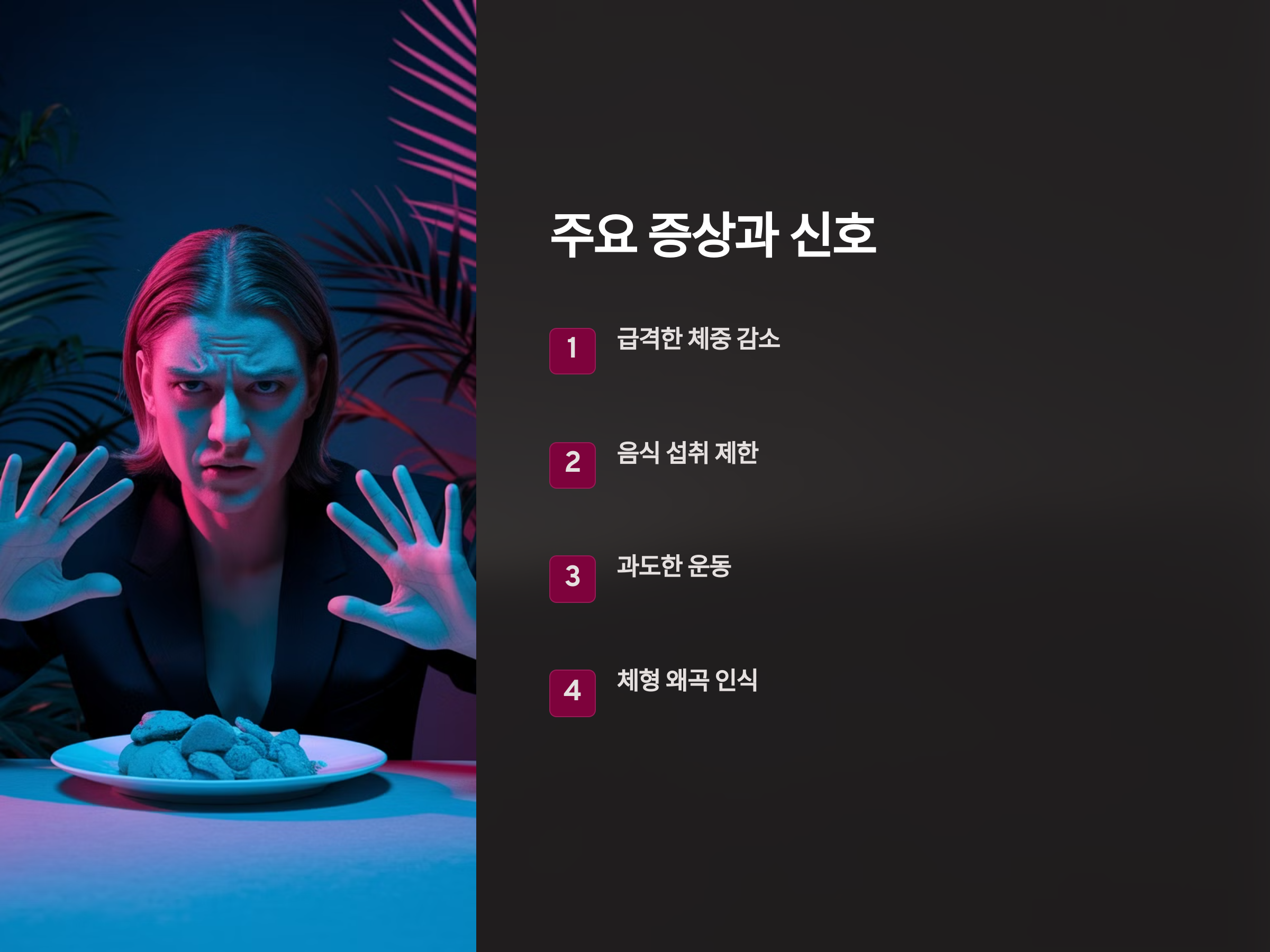신경성 식욕부진은 단순한 다이어트가 아닌 심각한 섭식 장애입니다. 다음과 같은 주요 증상을 보인다면 즉시 전문적인 상담이 필요합니다.